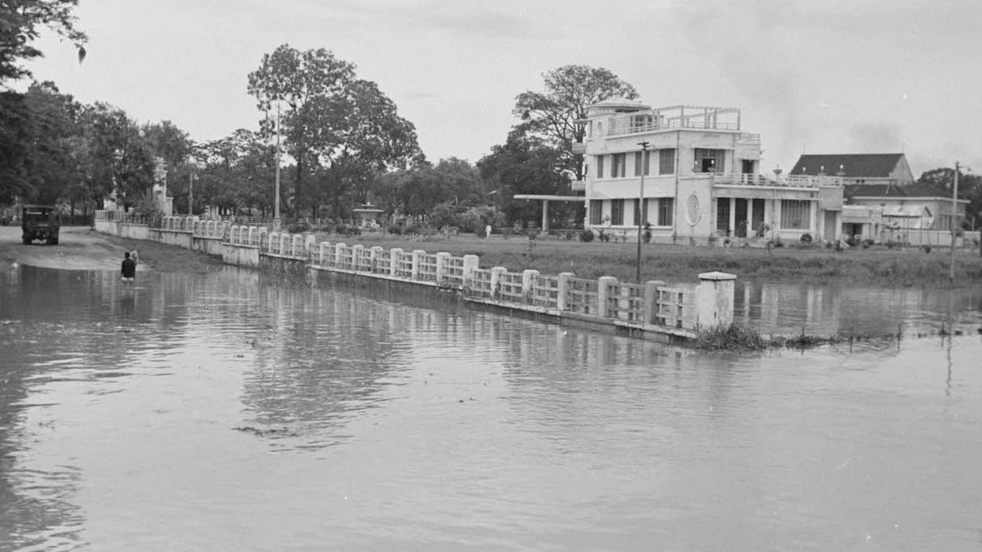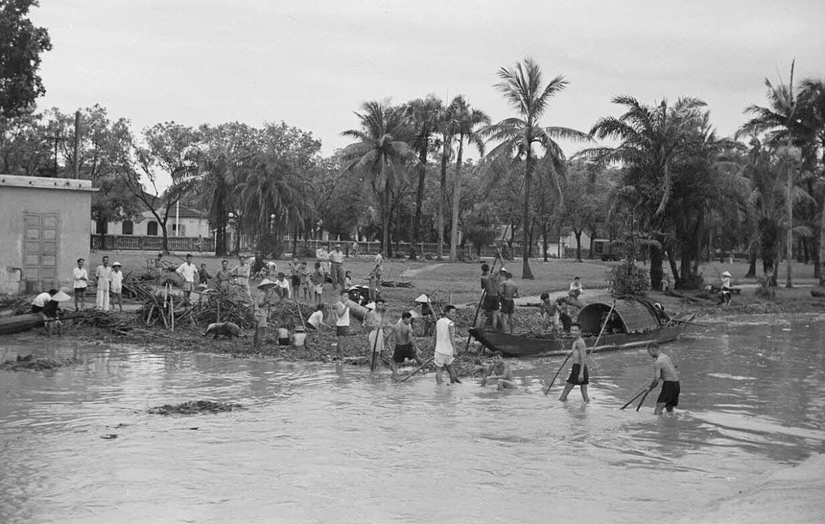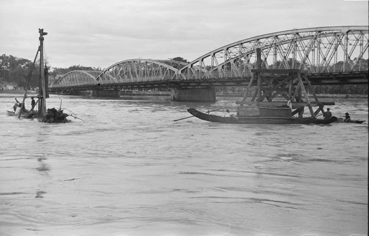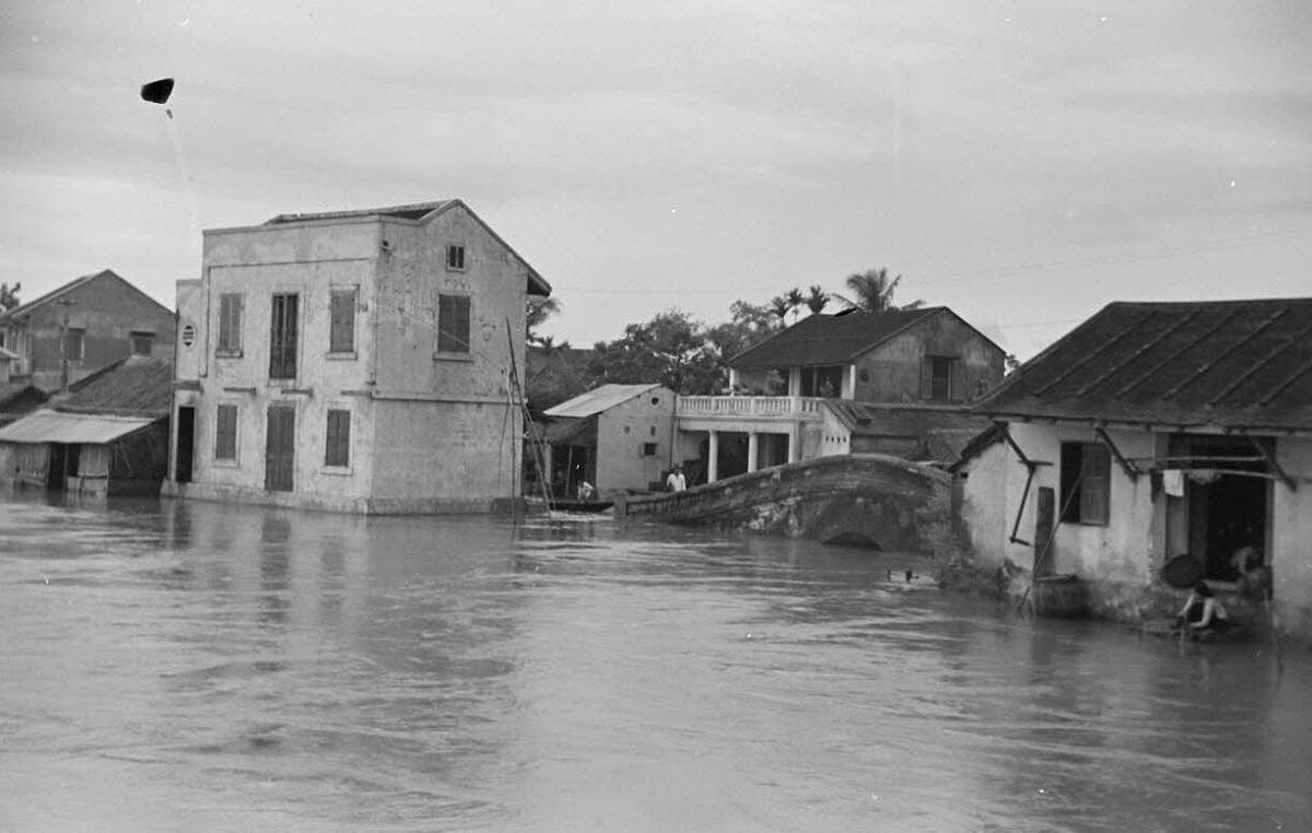 Cầu Trường Tiền, phố cổ Bao Vinh, khách sạn và nhiều công trình, nhà dân ở Huế bị nước lũ bủa vây trong bộ ảnh hiếm của nhiếp ảnh gia người pháp Fernand Jentile ghi lại vào tháng 6/1953.