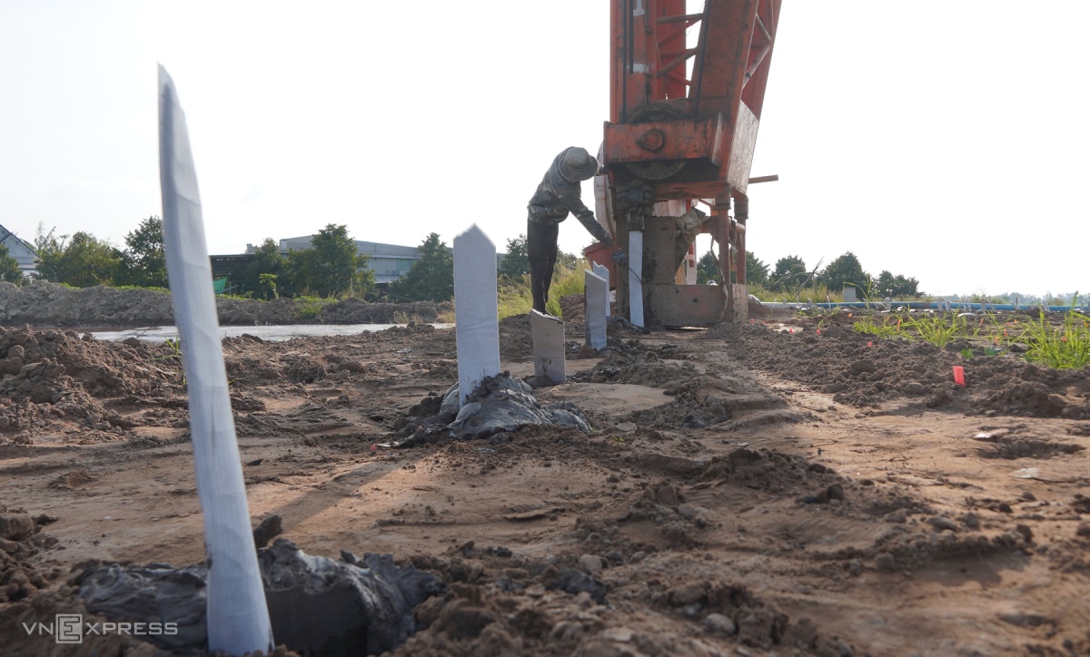 Công nhân Công ty 68 thi công đóng bấc thấm tại đoạn cao tốc qua xã Trường Xuân, TP Cần Thơ. Mỗi mũi bấc cách nhau 1–1,2 m, cắm sâu 11–12 m, sau đó liên kết với hệ thống bấc thấm ngang.