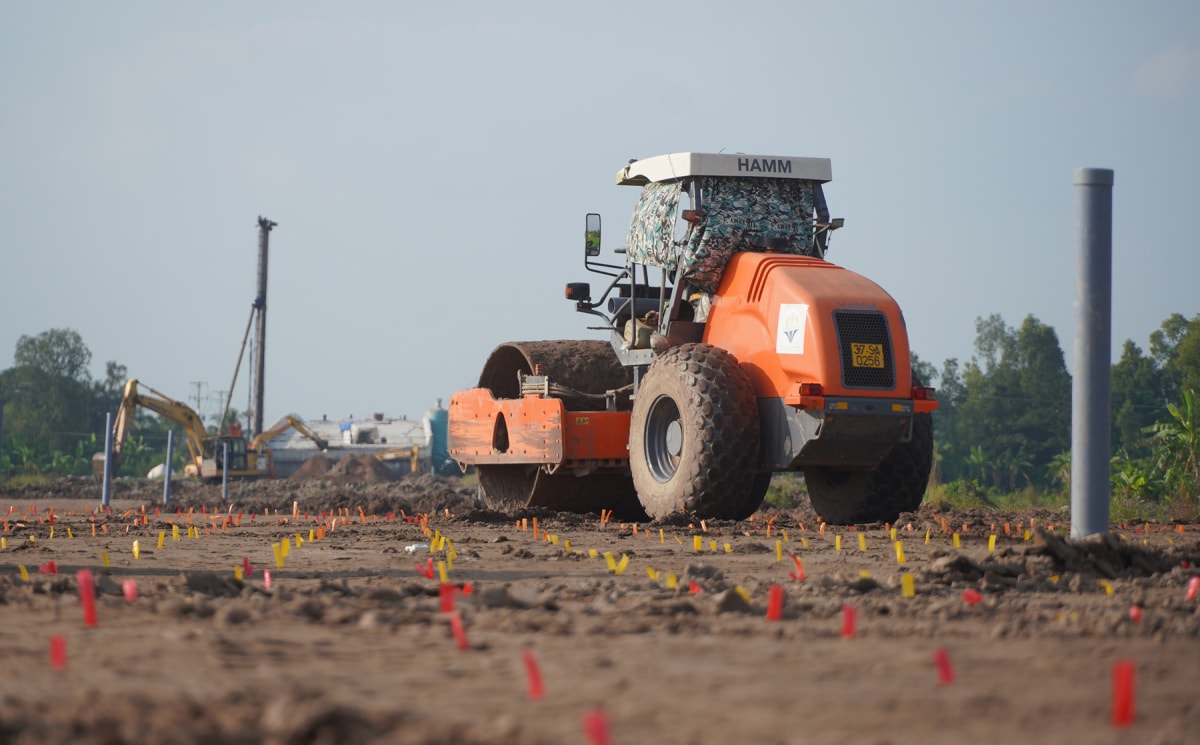 Đơn vị thi công lu lèn nền đường sau khi xử lý bấc thấm và đắp cát gia tải trên đoạn cao tốc qua TP Cần Thơ, nhằm đẩy nhanh thoát nước, tăng độ ổn định nền đất yếu, hạn chế lún nứt.