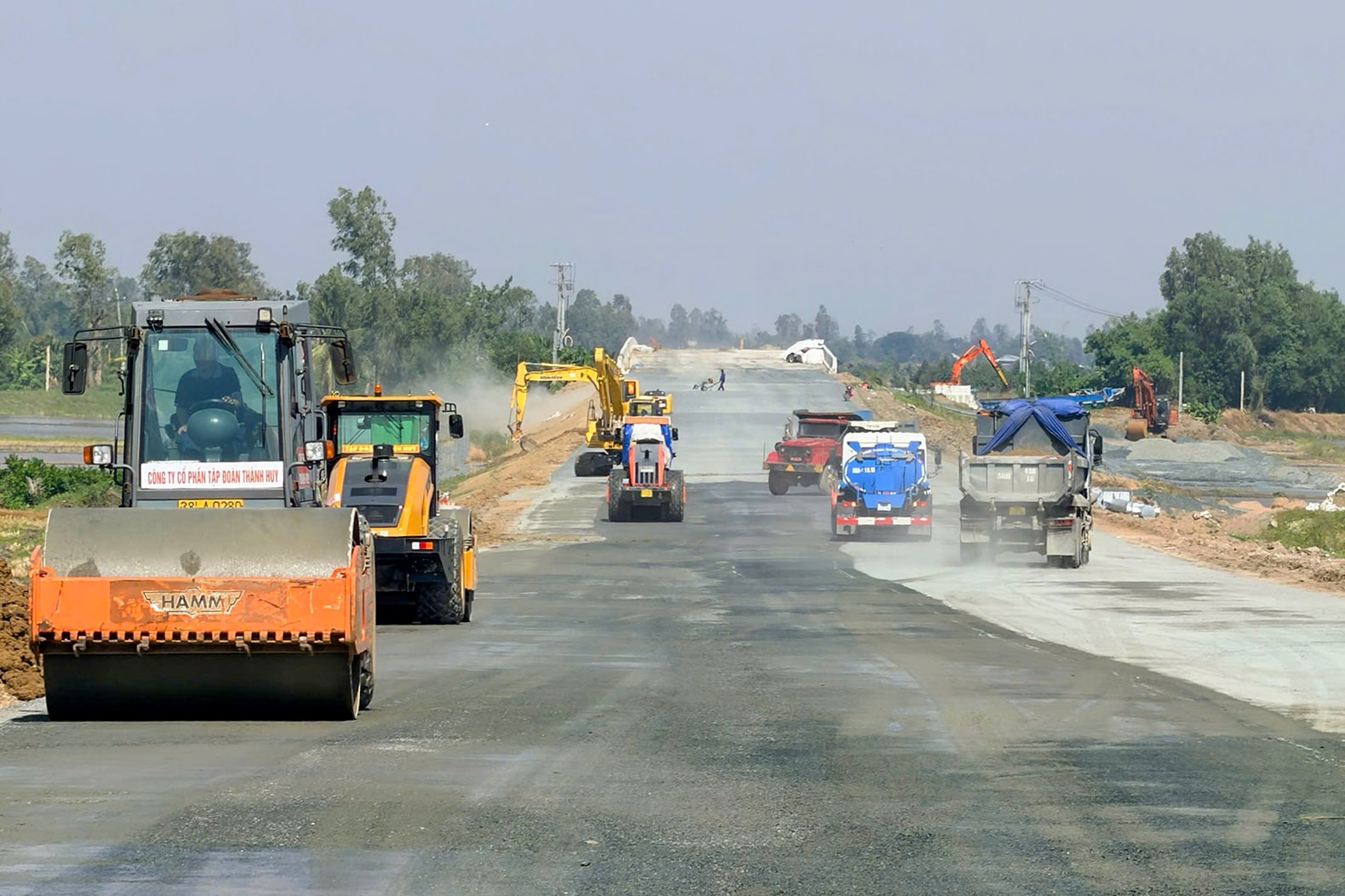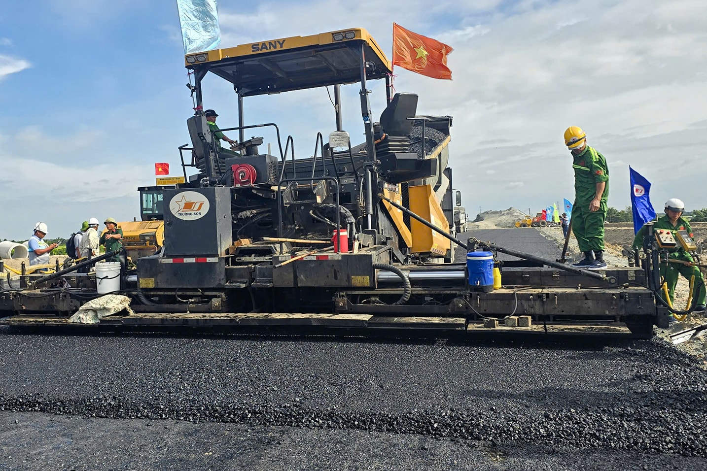 Công nhân thi công thảm nhựa đoạn cao tốc qua An Giang. Đến nay, dự án thành phần 1 đã hoàn thành khoảng 70% khối lượng và được thông xe kỹ thuật ngày 19/12/2025.