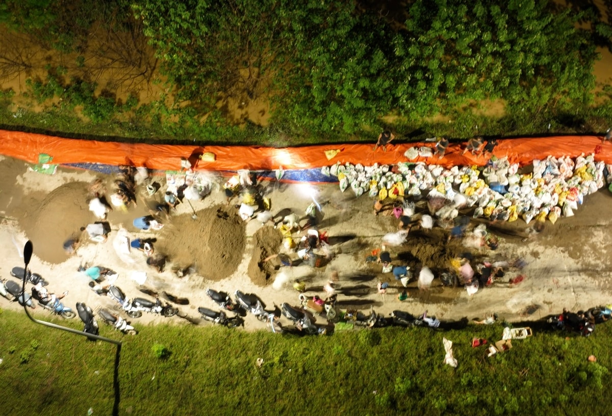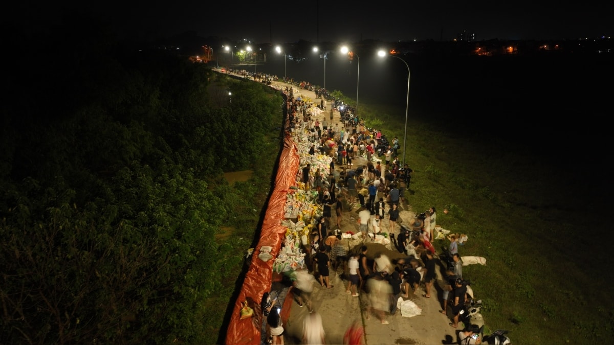 Suốt đêm 8/10, hàng trăm người dân cùng lực lượng chức năng xúc từng bao cát, tạo đập ngăn dòng lũ sông Cầu sắp tràn bờ đê.