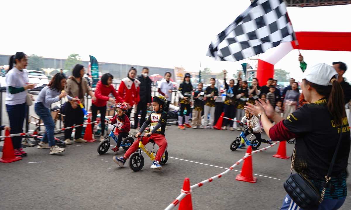 Bé Quốc An (4 tuổi - số 143) tham gia đua xe chòi chân cùng các bạn. Mẹ của An, chị Vũ Thị Thúy (Long Biên, Hà Nội) nói biết đến sự kiện thông qua mạng xã hội. "Nhà tôi chưa có đủ điều kiện mua xe, cả nhà đến đây chủ yếu tham quan, cho bé vui chơi, trải nghiệm", chị cho biết. Ảnh: Thành Nhạn