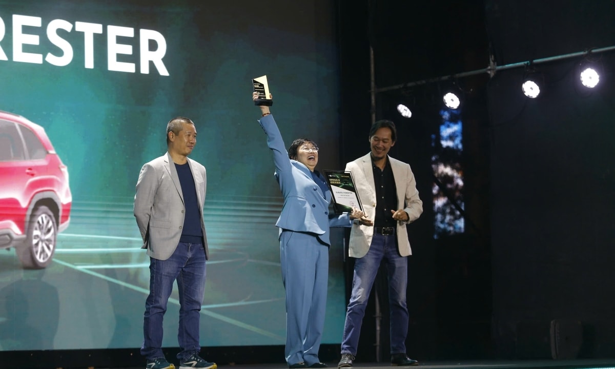 Bà Lê Thanh Hải, Tổng giám đốc Subaru Việt Nam, trong niềm vui chiến thắng khi chiếc Forester nhập khẩu Nhật Bản giành giải Ôtô của năm phân khúc gầm cao cỡ C. Ảnh: Lương Dũng