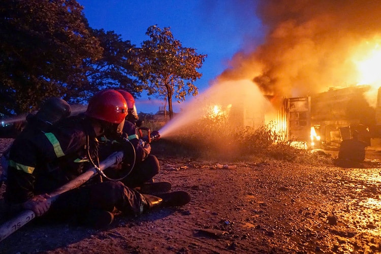 Do nhiệt lượng lớn, việc tiếp cận gặp khó khăn, lực lượng cứu hỏa phải chia nhiều hướng, phun bọt dập lửa quanh hai xe bồn, đồng thời phun nước làm mát container và khu vực bãi đất trống tiếp giáp cây xăng để tránh cháy lan.