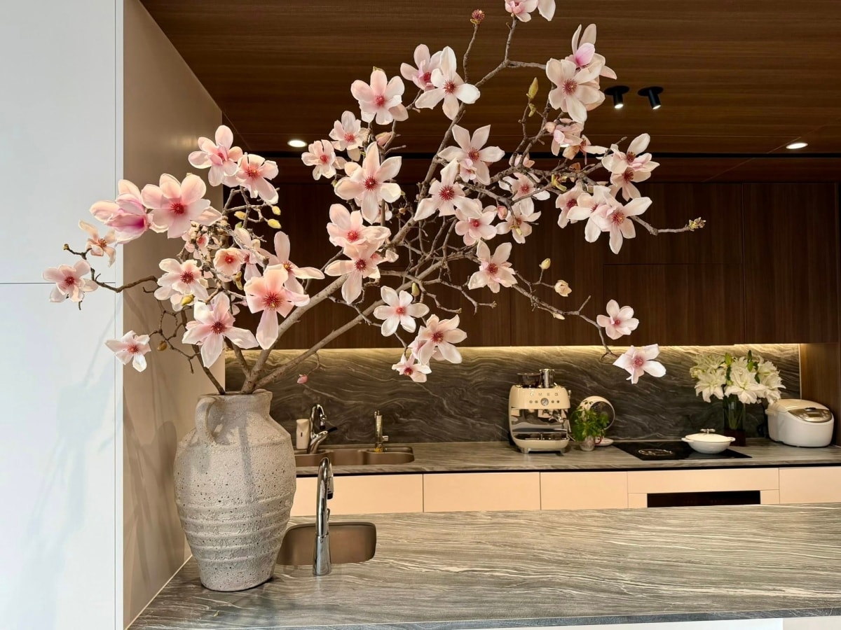 Chị Khánh My ở Hà Nội bắt đầu bén duyên với mộc lan từ tháng 10/2025 bởi ấn tượng với những cánh hoa dày mịn như sáp, ôm lấy nhau tạo vẻ đẹp trầm tĩnh, không phô trương. "Mộc lan đặt vào góc nào cũng đẹp, đặc biệt rất hợp với không gian bếp", chị My nói.