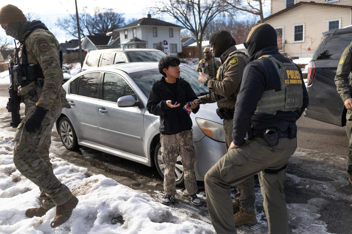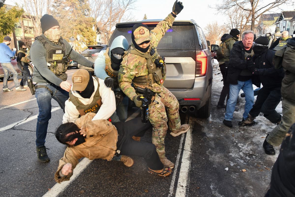 Trong ảnh, các đặc vụ liên bang ngày 12/1 kiểm tra tình trạng nhập cư của một thanh niên ở Minneapolis. Thanh niên này sau đó bị bắt vì không xuất trình được giấy tờ chứng minh tình trạng lưu trú hợp pháp.