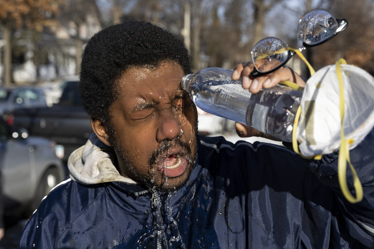 Người đàn ông rửa mắt sau khi dính khói hơi cay trong một cuộc đụng độ giữa người dân và các đặc vụ liên bang, ngày 13/1.