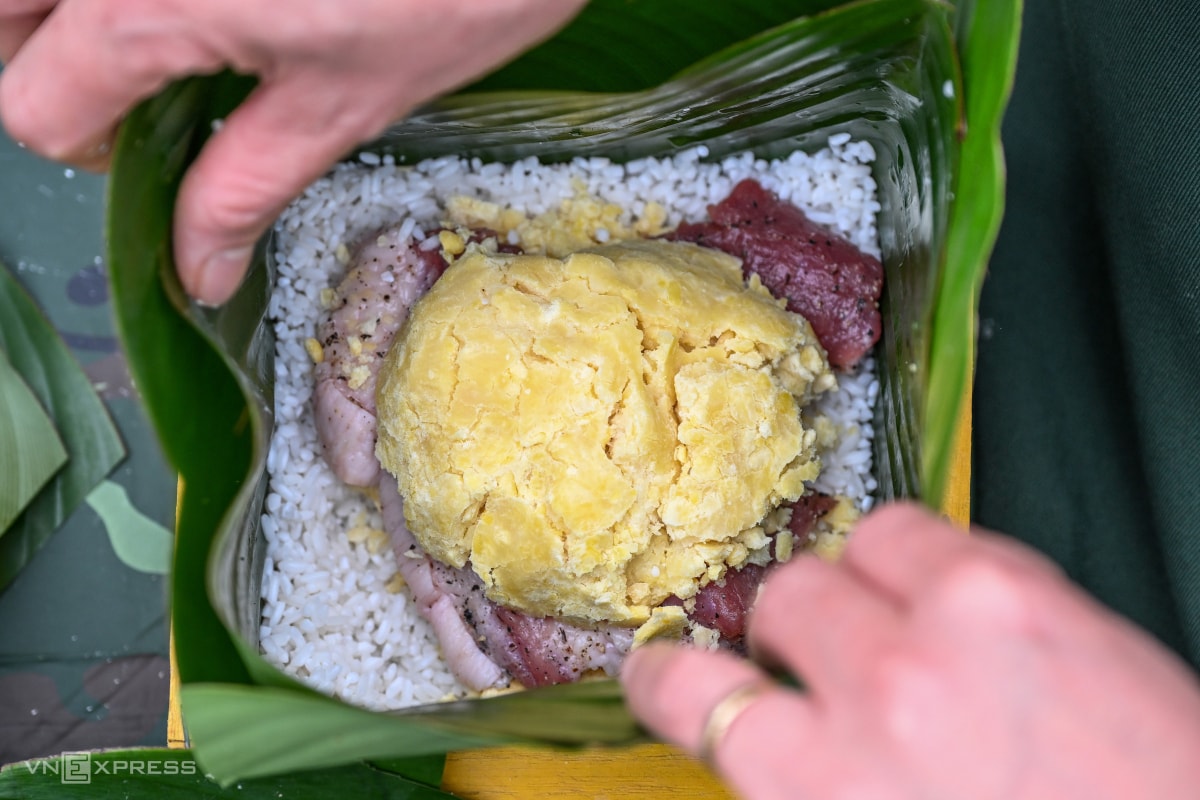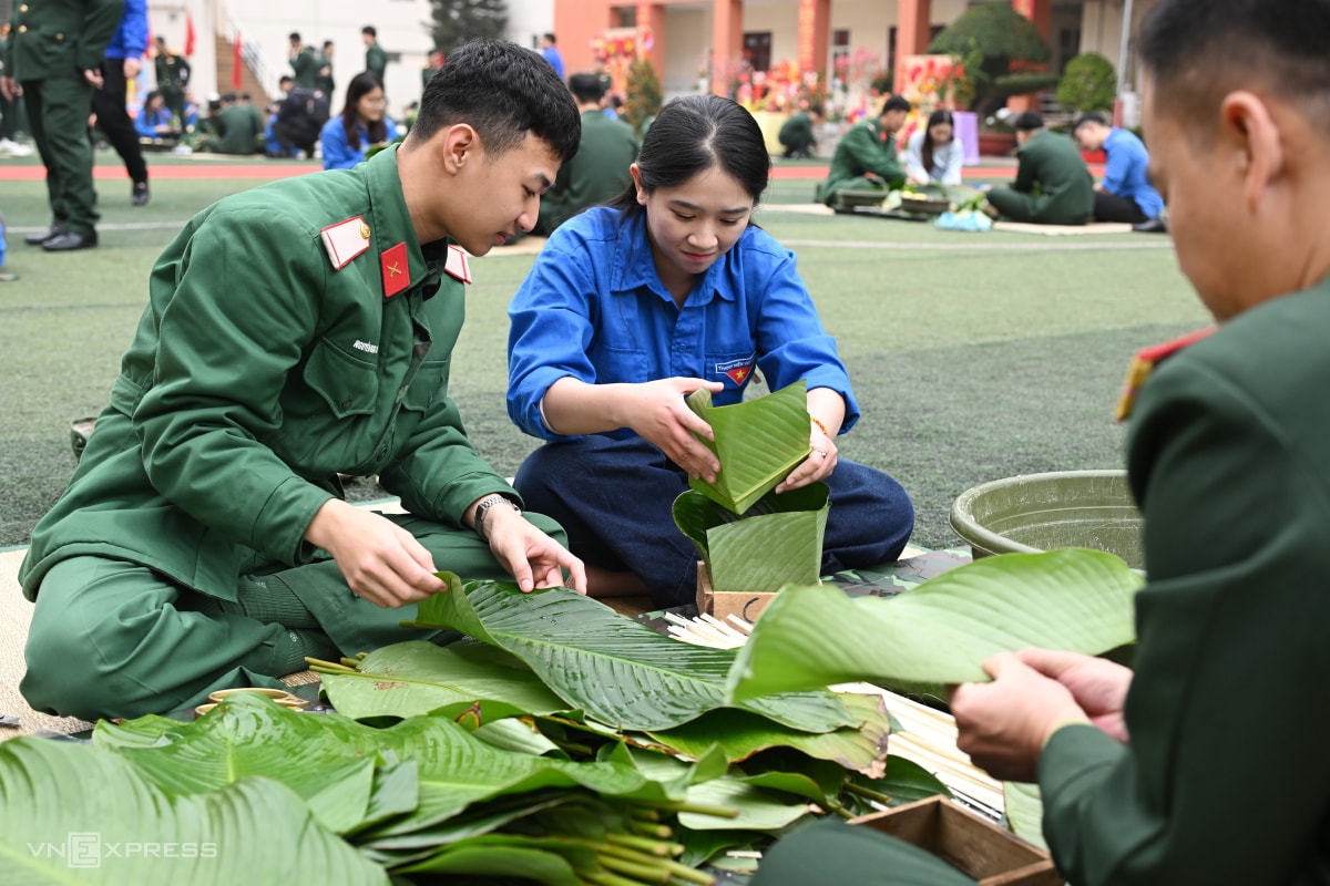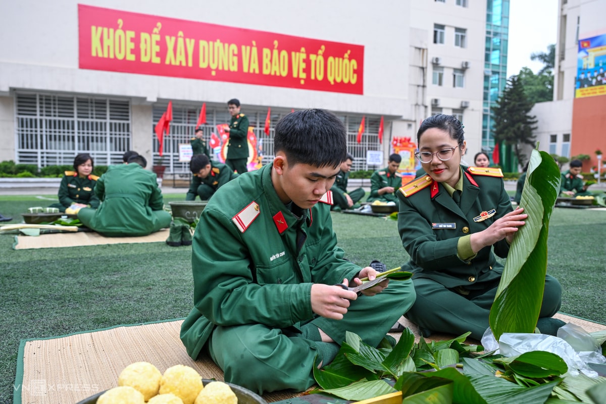 Chiến sĩ Lữ đoàn 144, Bộ tổng Tham mưu tham gia thi gói bánh chưng với tiêu chí bánh đúng kích thước tiêu chuẩn, vuông góc cạnh, lá xanh và phẳng.
