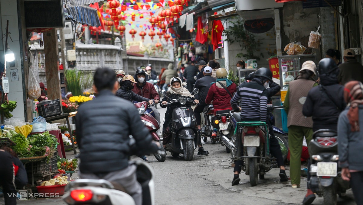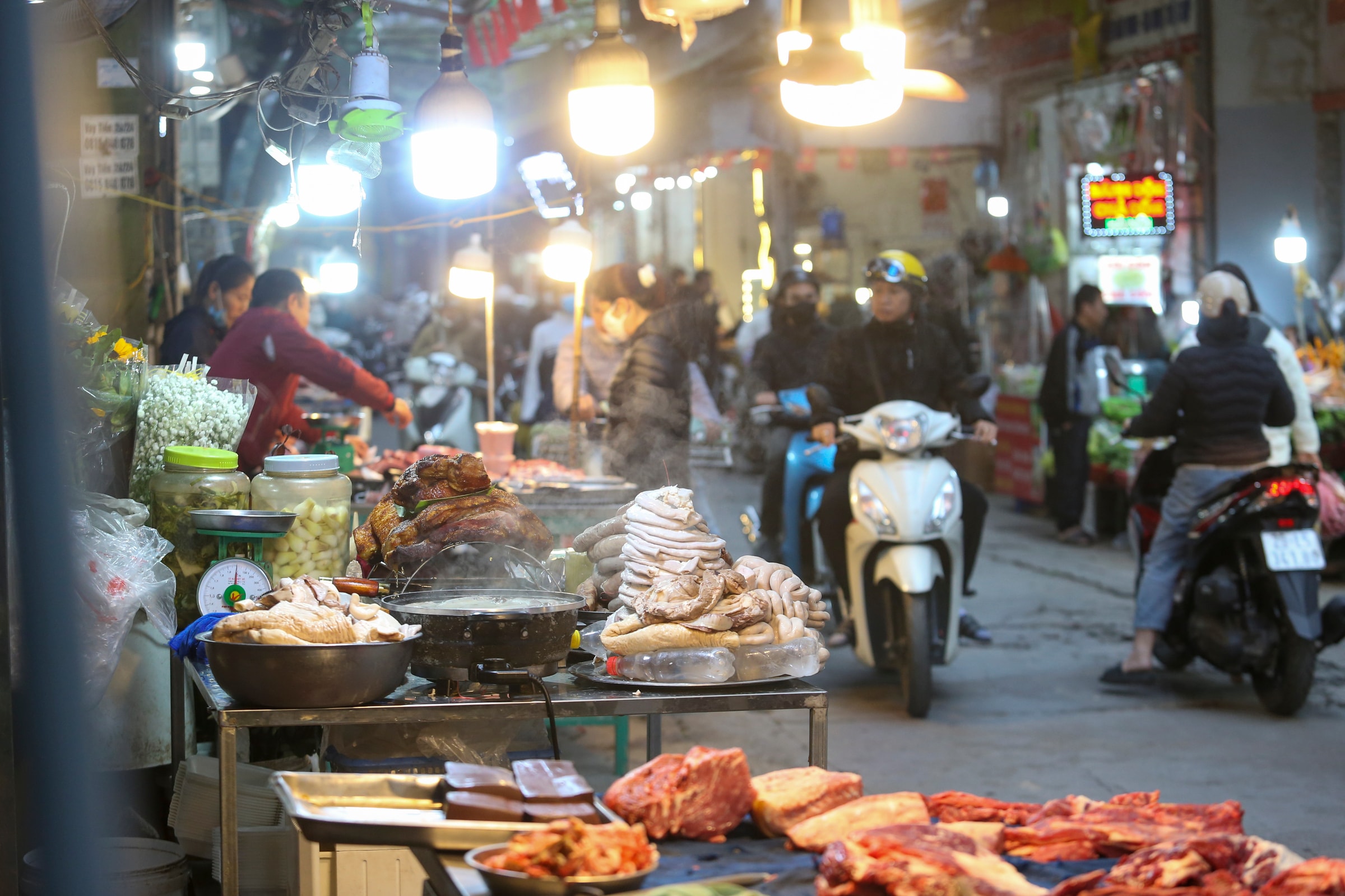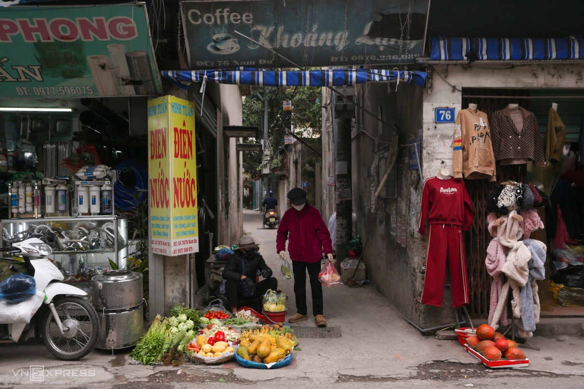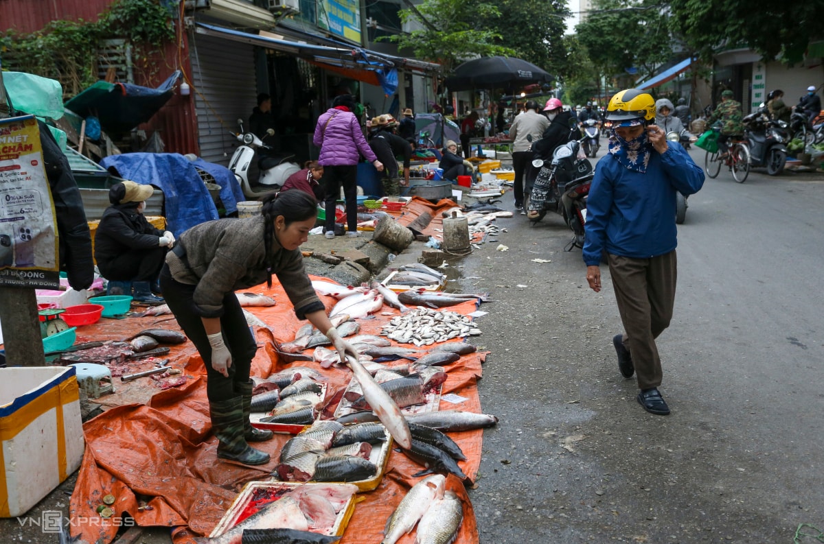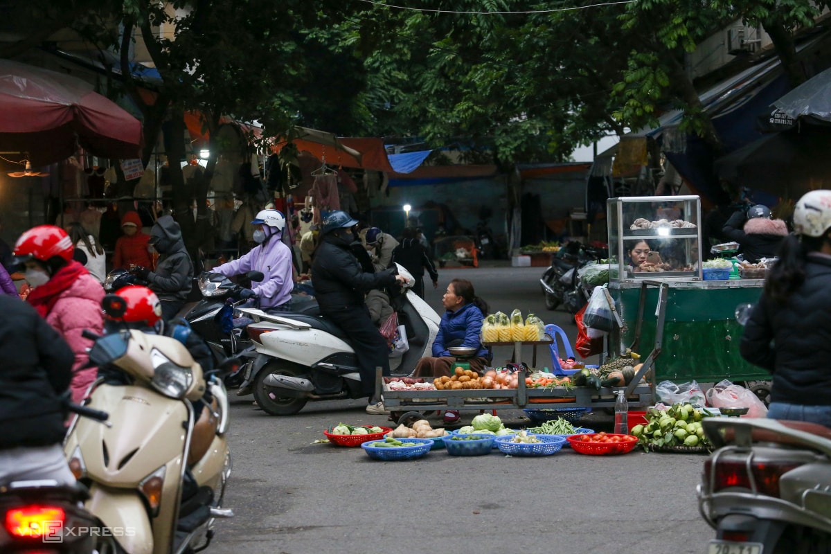 Dọc phố Nam Dư, phường Vĩnh Hưng, tập trung khoảng 100 sạp bán thực phẩm, hàng tiêu dùng.
