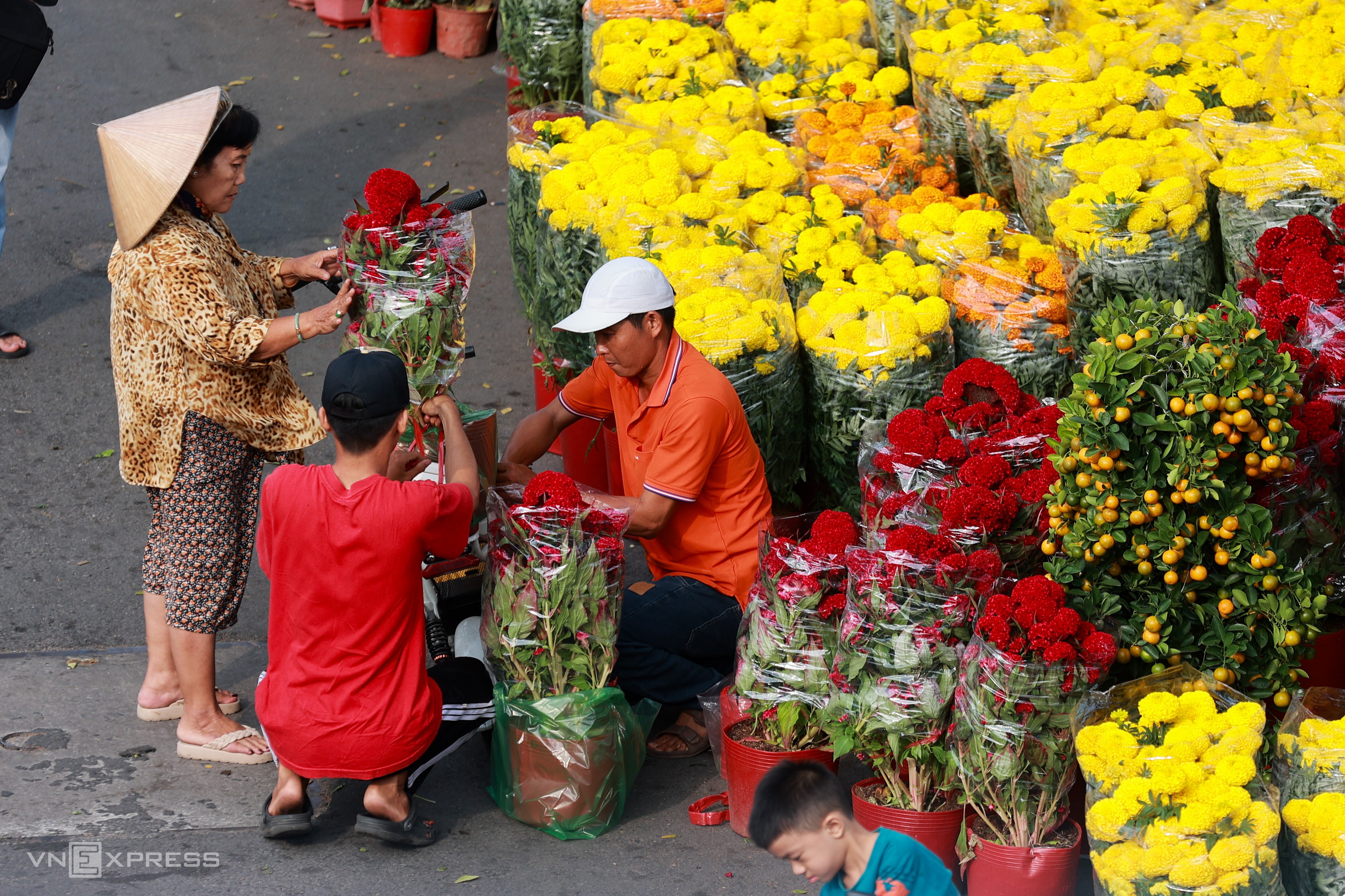 Trong ngày đầu nghỉ Tết, chợ hoa nhộn nhịp mua bán. Nhiều người dân chấp nhận đi hơn 10 km để đến đây vì nguồn hoa phong phú, giá cả hợp lý. "Tôi mua ba chậu hoa giấy này chỉ 100.000 đồng, thấy ưng là lấy luôn, không cần mặc cả", bà Đinh Thị Thu Thủy (62 tuổi) nói.