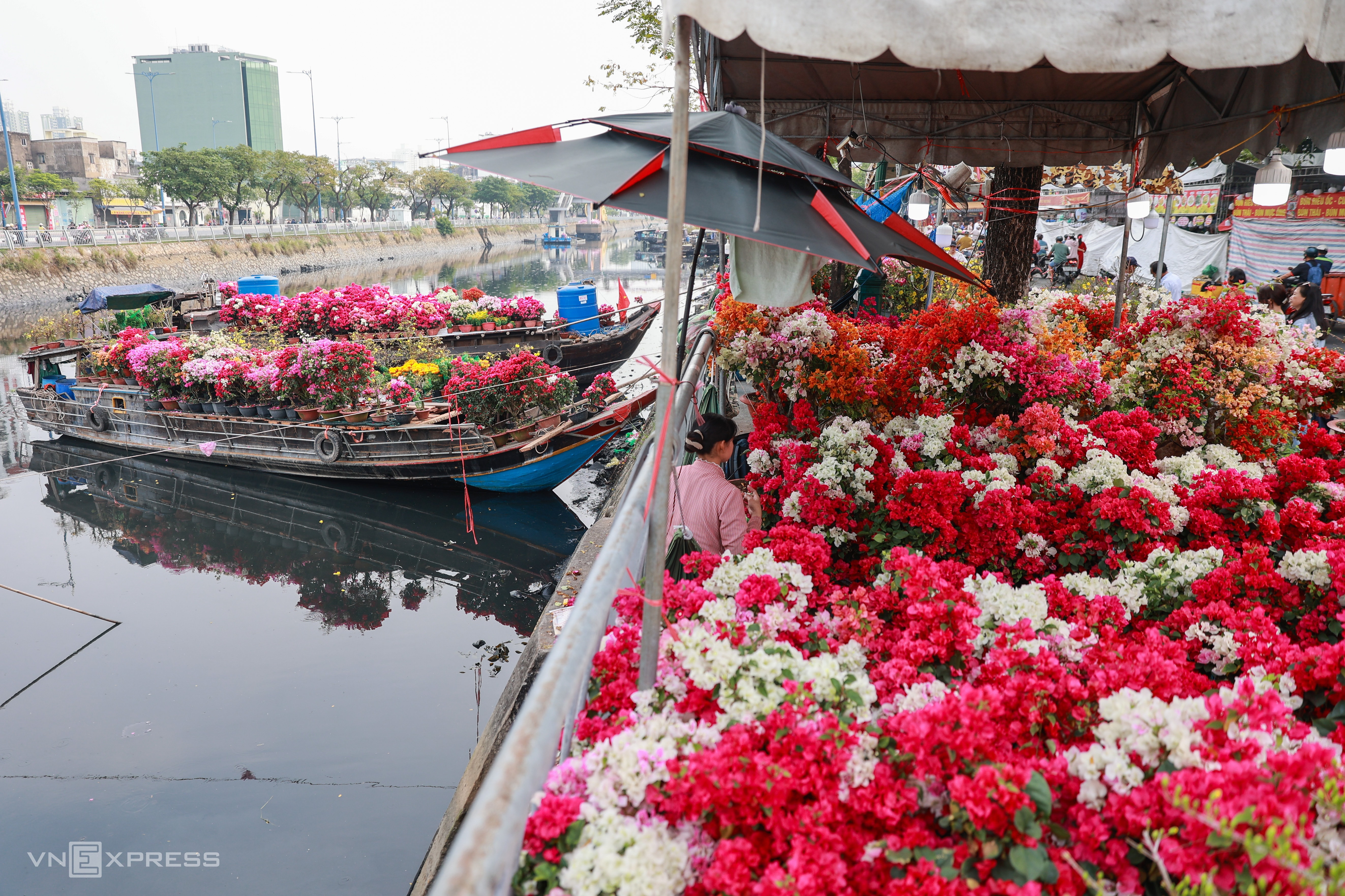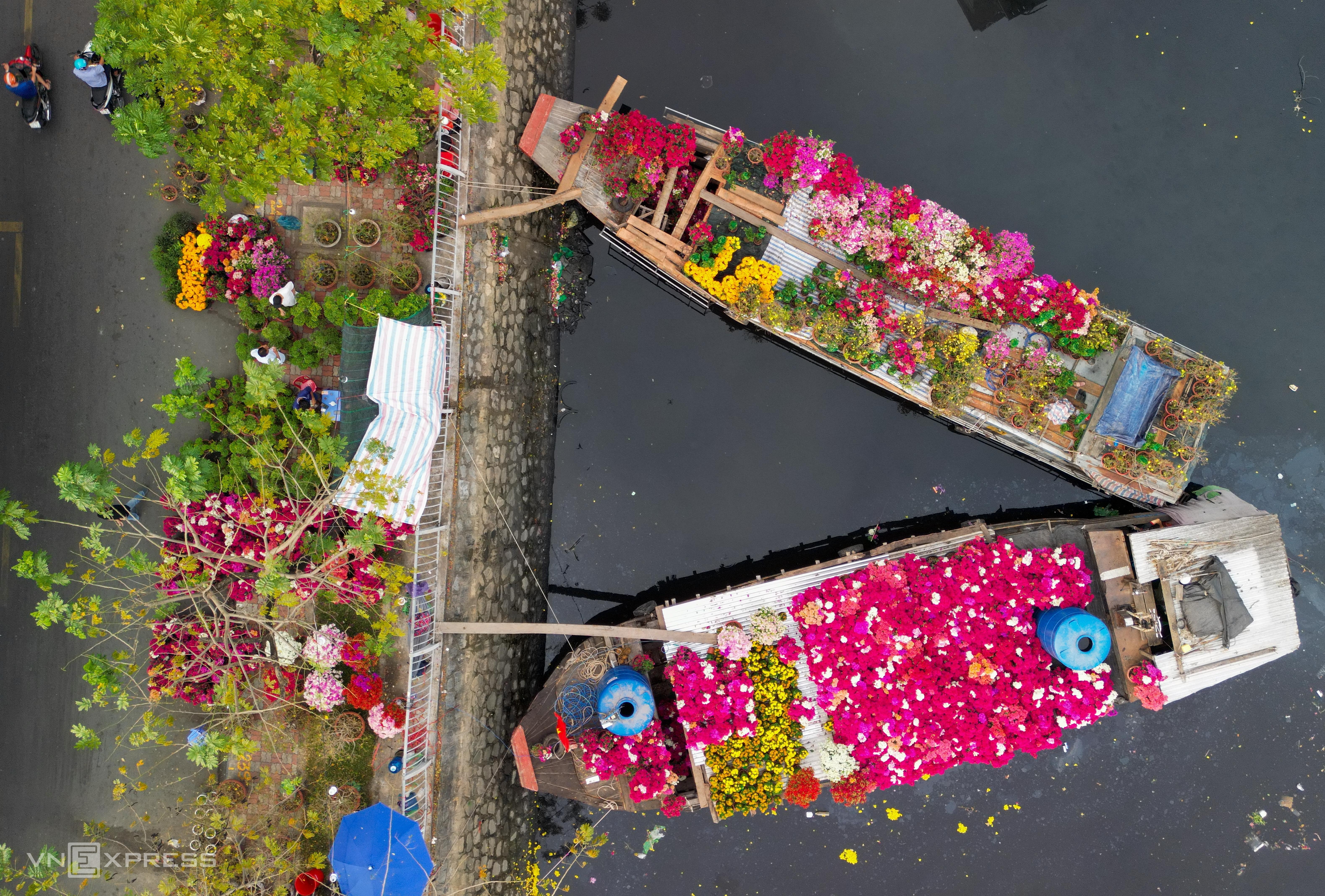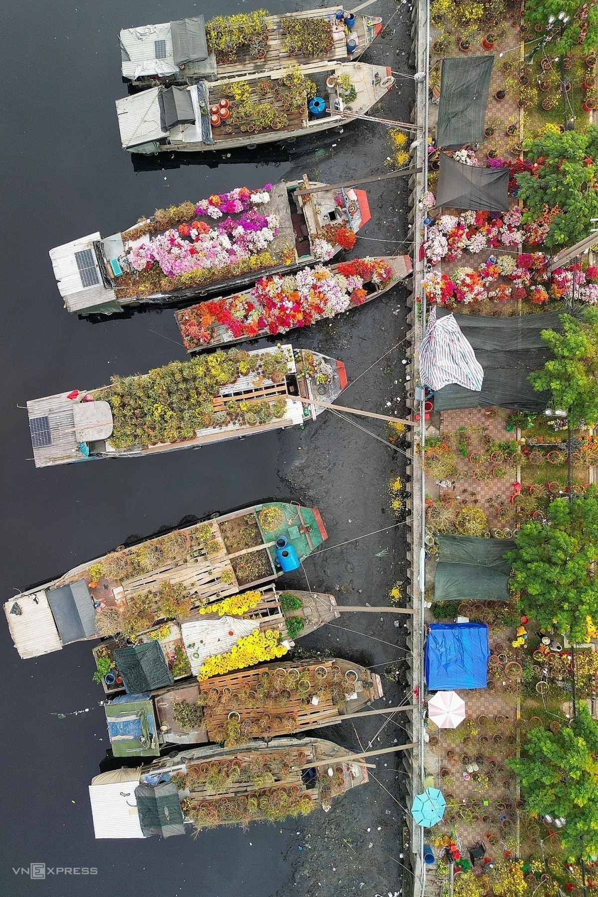 Các ghe thuyền neo đậu sát bờ kênh Tàu Hủ, trải dài hơn một km. Chợ hoa năm nay quy tụ trên 500 gian hàng của doanh nghiệp, hợp tác xã và nhà vườn đến từ TP HCM cùng các tỉnh lân cận.