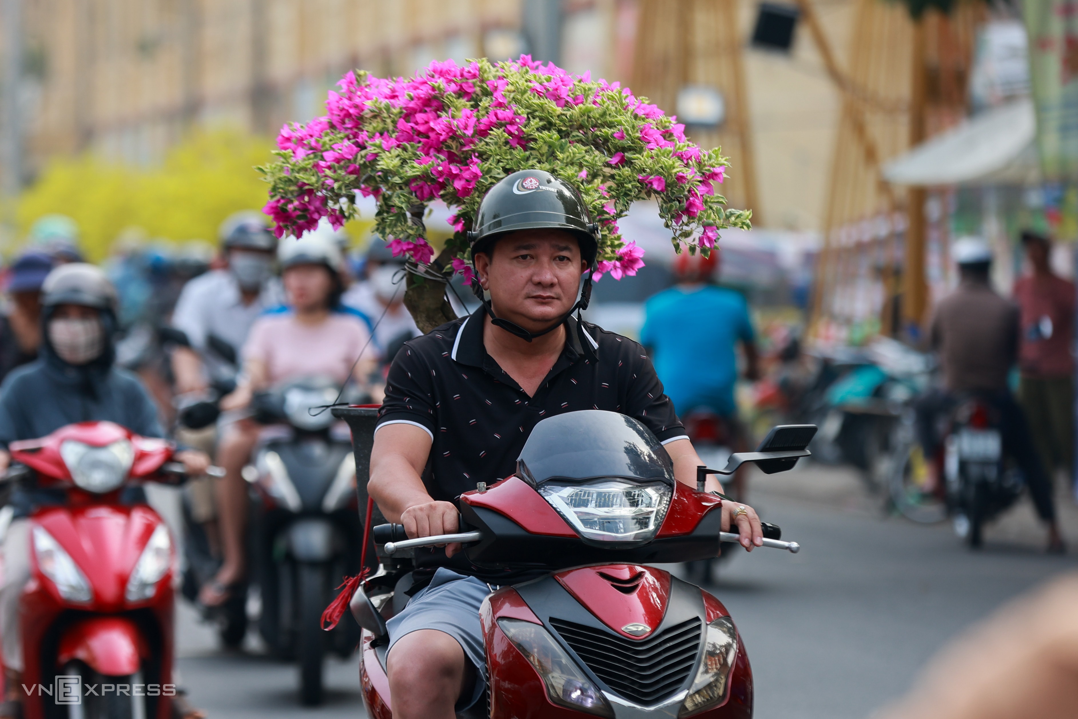 Nhiều người thuê taxi chở các chậu hoa nhỏ về nhà. Dọc đường Bến Bình Đông, đội ngũ xe chở hàng thuê liên tục hoạt động để phục vụ khách mua hoa chơi Tết.
