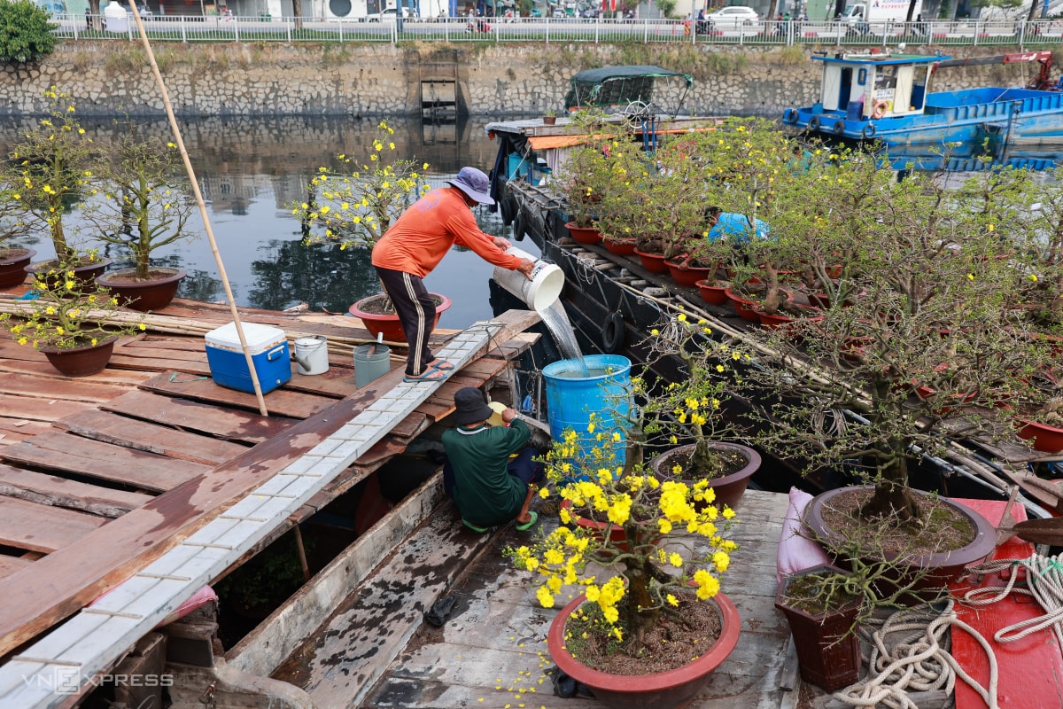 Tiểu thương tất bật chuyển hoa Tết từ ghe lên bờ. Trên chiếc ghe chở hoa, ông Nguyễn Văn Út mang theo khoảng 400 chậu mai lên TP HCM bán. Ông cho biết, phần lớn thương hồ neo đậu tại bến xuất phát từ vùng trồng hoa Chợ Lách (Bến Tre), theo dòng nước "chở mùa xuân" lên thành phố suốt 15-20 năm nay.