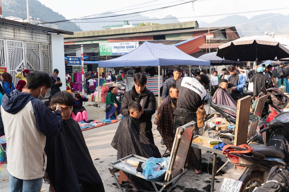 Khoảng 12h30, chợ bắt đầu vãn nhưng dịch vụ cắt tóc vỉa hè lúc nào cũng "đắt hàng". Phiên chợ không đơn thuần là nơi buôn bán, còn tái hiện không gian văn hóa sống động của các dân tộc thiểu số như H'Mông, Dao, Tày.