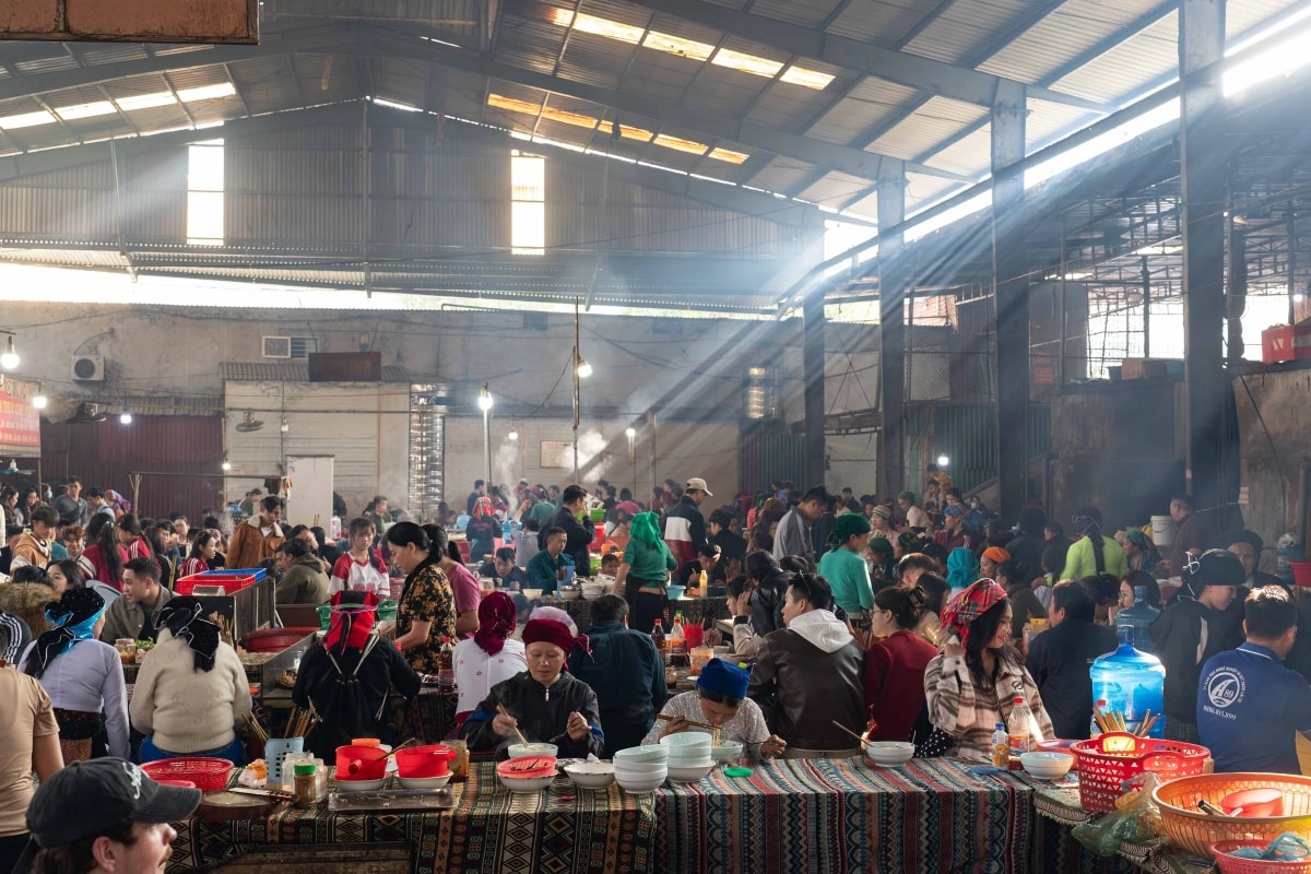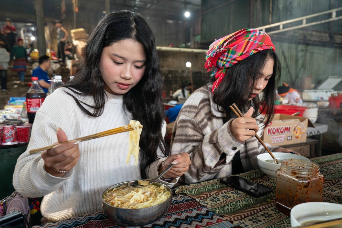 Nằm ở trung tâm chợ phiên, khu ẩm thực là điểm đông vui nhất khi người dân, du khách đổ đến để thưởng thức các món địa phương như thắng cố, phở, mèn mén, bánh cuốn.