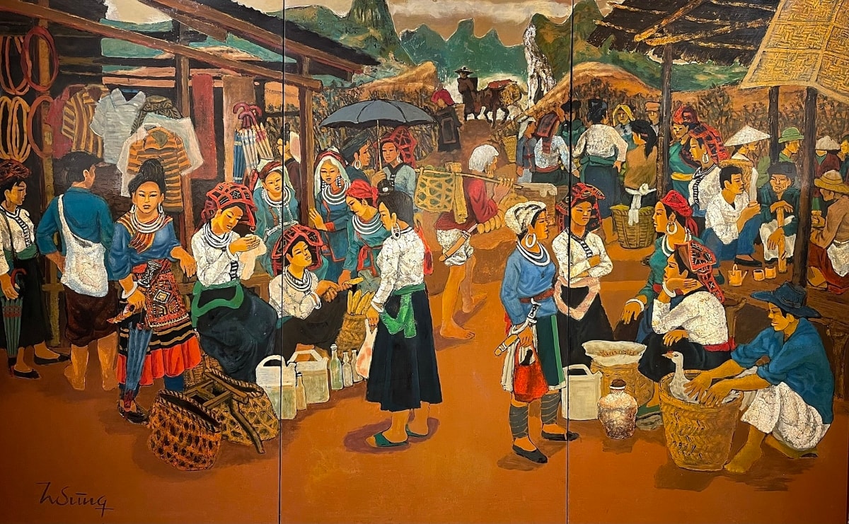 Họa sĩ Hoàng Sùng tái hiện phiên chợ vùng cao, người nô nức mua bán, qua các tác phẩm sơn dầu, giấy dó.