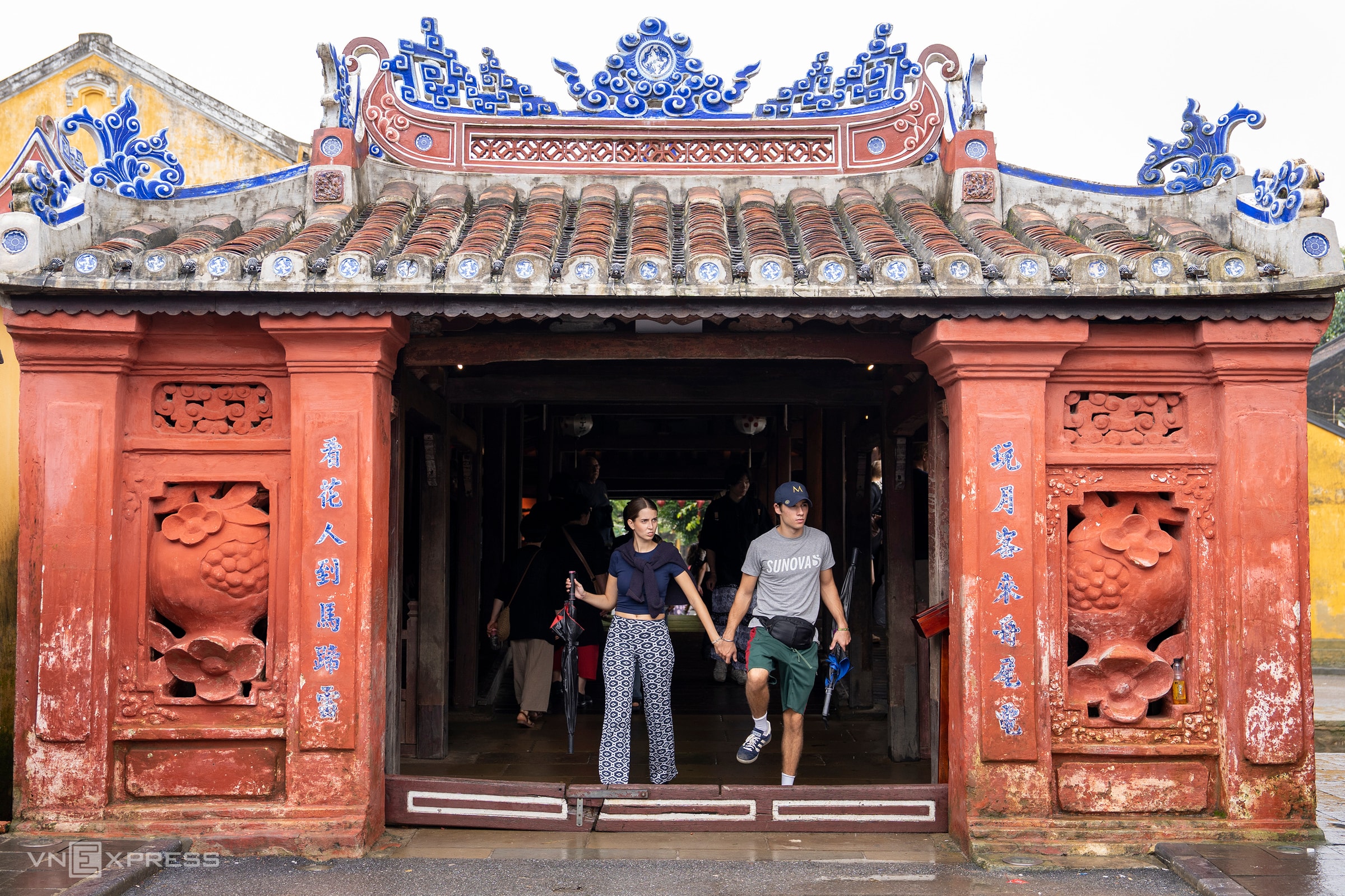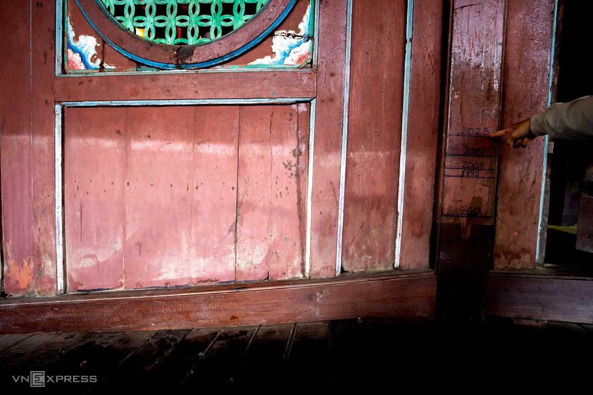 Mốc lũ năm 2025 đã được nhân viên soát vé ở chùa Cầu đánh dấu lên vách gỗ trước cổng, cao nhất tính từ lụt năm 1999.