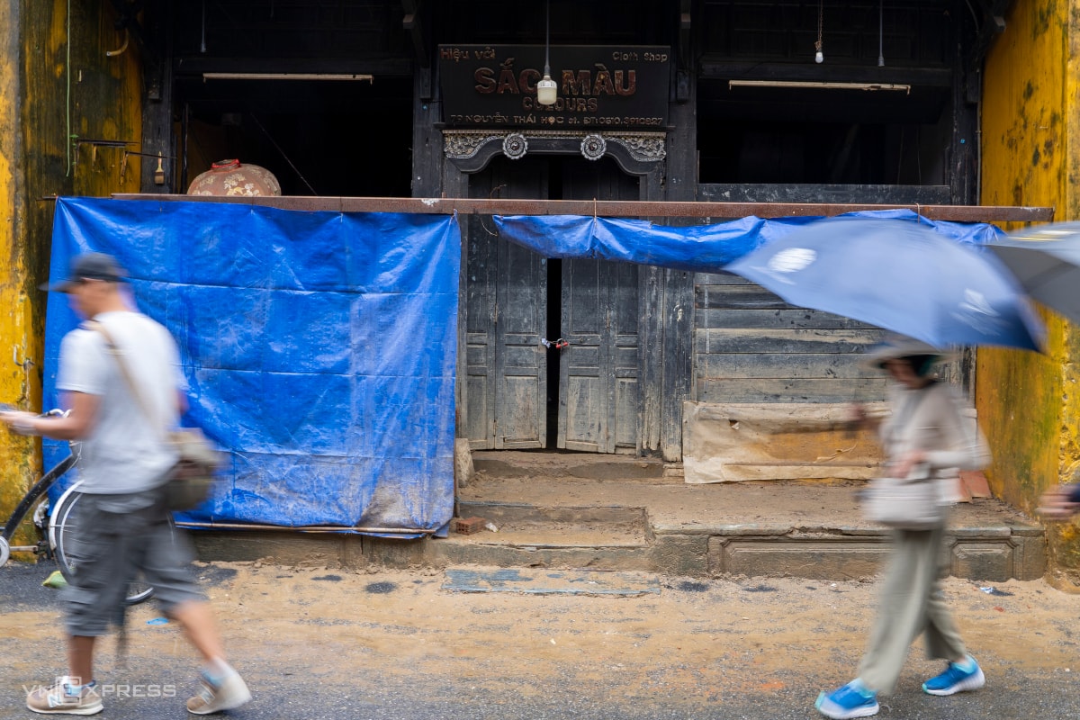 Một ngôi nhà cổ kinh doanh hiệu vải trên đường Nguyễn Thái Học đang trong quá trình cải tạo thì bị ngập lũ, gia chủ đành khóa cửa, chờ khô ráo mới có thể tiếp tục thi công.