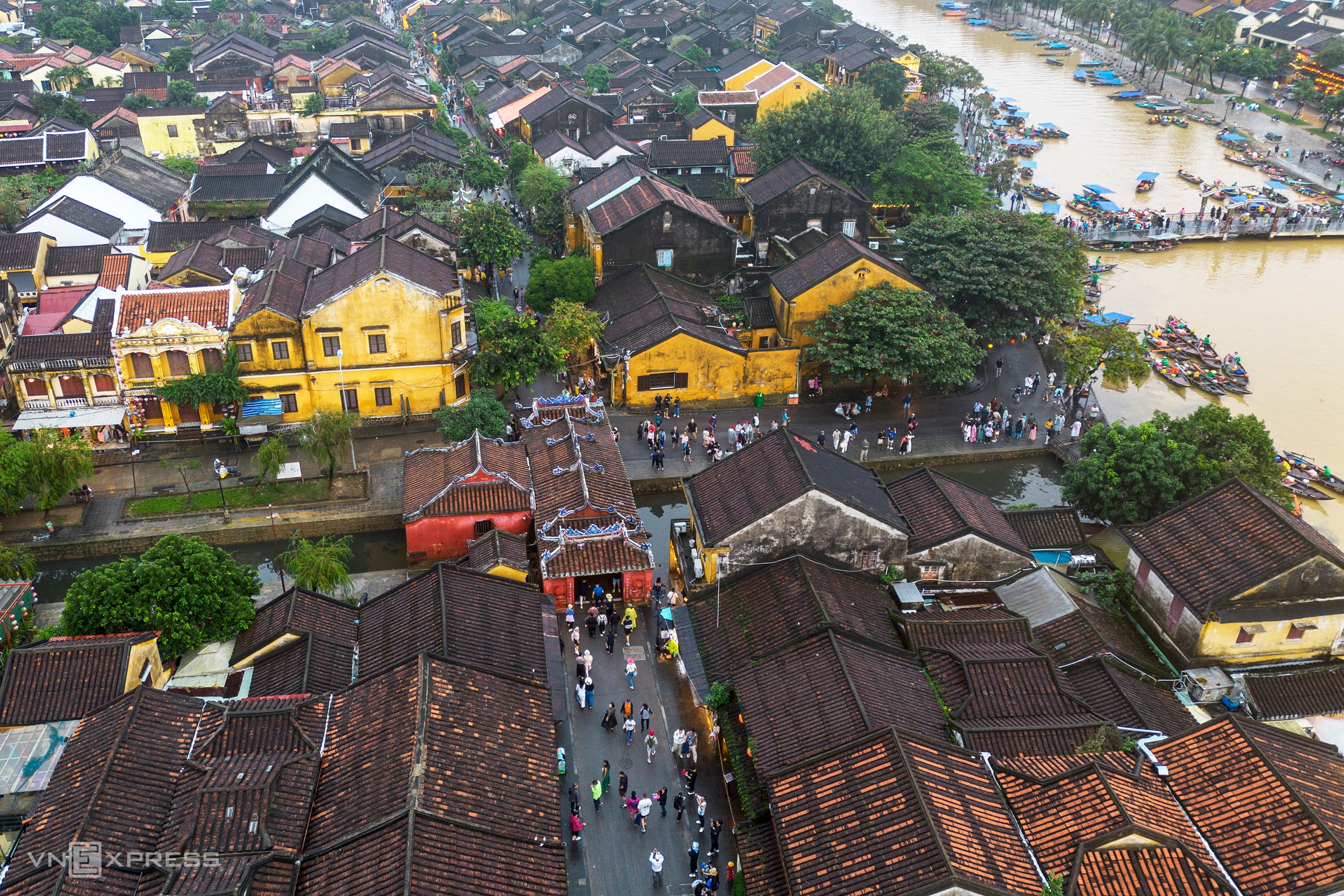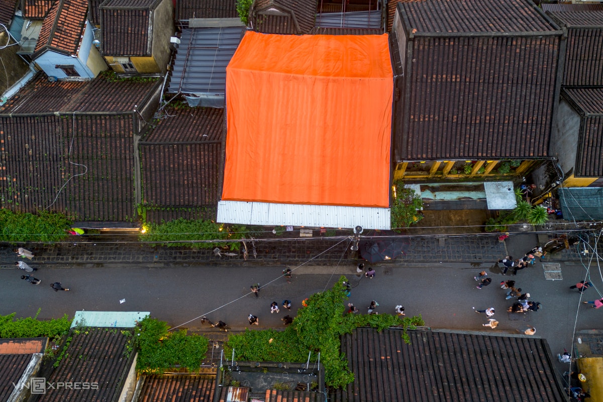 Sau những đợt mưa lớn kéo dài, nhiều mái ngói âm dương nhà cổ Hội An cũng bị hư hại, gia chủ phải dùng bạt che tạm, dù phương pháp này khiến thẩm mỹ phố cổ nhìn từ trên cao bị ảnh hưởng.