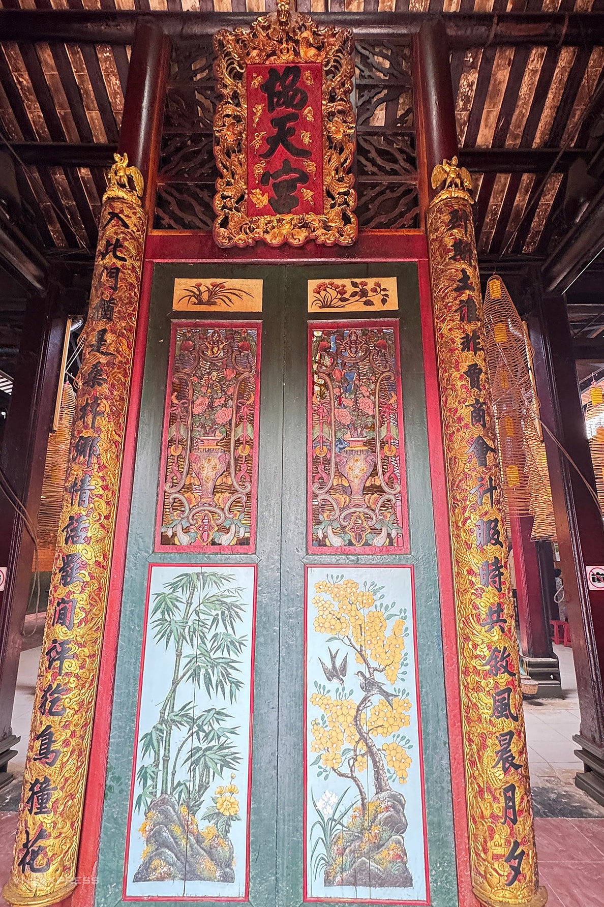 Tấm nghi môn "Hiệp Thiên Cung" được đặt ngay sau cửa chính chùa Ông. Sau tấm nghi môn là không gian thờ tự thiêng liêng các vị thần, nhân vật hiển thánh được cộng đồng sùng bái.