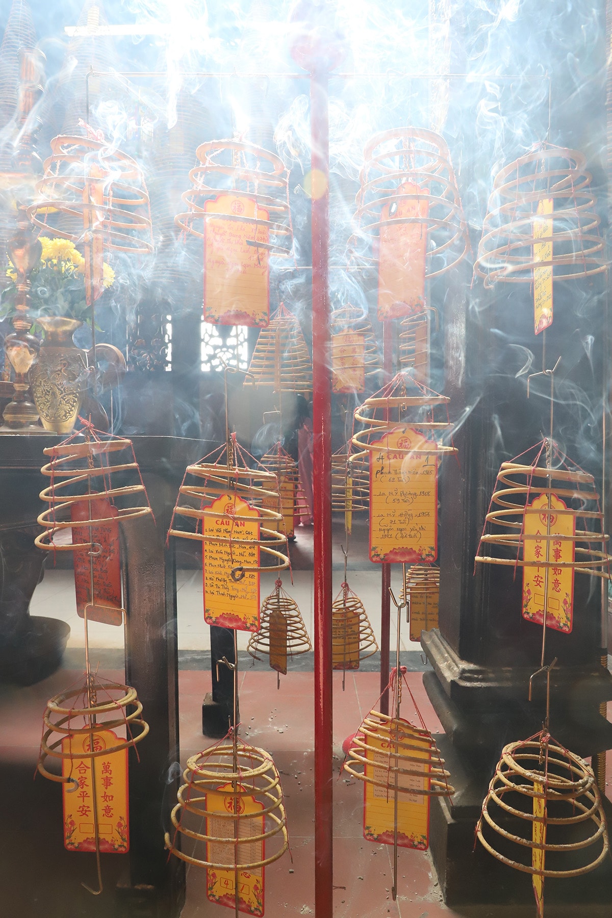Hình thức cầu an, cầu phúc phổ biến nhất ở chùa Ông là cúng nhang khoanh. Khách đến chùa viết tên của người cầu phúc lên các tấm thẻ bài, bằng chữ Việt ngữ hay chữ Hán tùy theo thân chủ rồi gắn vào khoanh nhang.