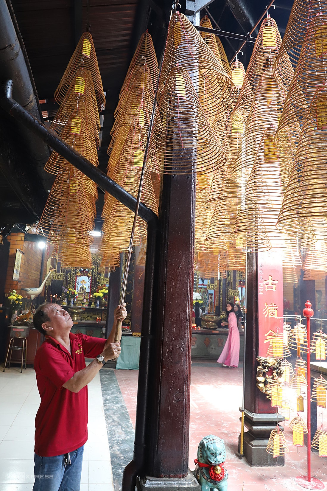 Sau khi người dân, du khách mang khoanh nhang đến và viết lá thẻ bài gắn vào thì ông Huỳnh Huy sẽ hỗ trợ đốt, treo lên và canh giữ cho nhang cháy suốt và an toàn.