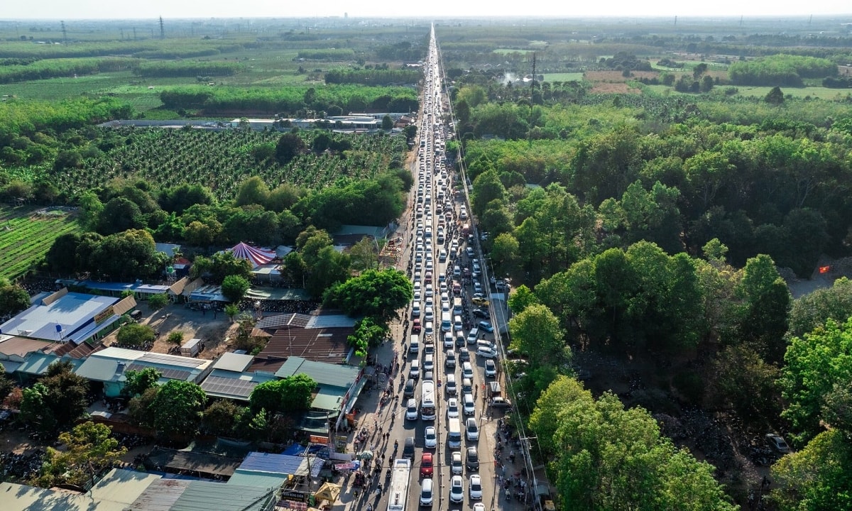 Trong hai ngày 20 và 21/2, dòng người hành hương đổ về Khu du lịch Quốc gia núi Bà Đen (Tây Ninh) tham dự Hội Xuân núi Bà Đen 2026 khiến giao thông khu vực ùn tắc kéo dài. Ba trục đường chính dẫn vào núi phương tiện ùn ứ hơn 10 km (ảnh). Anh Nguyễn Minh Tú, nhiếp ảnh gia tại TP HCM đến Tây Ninh 20/2, cho biết tuyến đường Bời Lời, con đường lớn nhất nối trung tâm Tây Ninh với khu du lịch, gần như "thất thủ”. Lực lượng CSGT lập hơn 10 chốt để phân luồng, điều tiết giao thông.