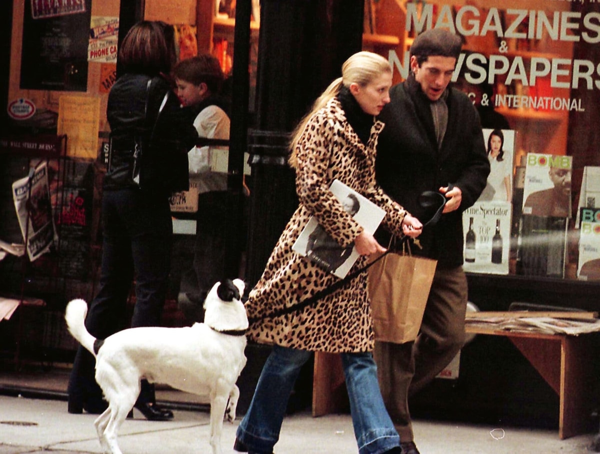 Cả hai thường xuyên được chụp ảnh khi dắt chó đi dạo. Tháng 1/1997, cặp vợ chồng đi ăn trưa tại một nhà hàng gần nhà ở khu TriBeCa. Họ mang theo chú chó Friday như mọi lần. Carolyn Bessette-Kennedy diện áo khoác đỏ tươi hiệu Prada, kèm quần jeans ống đứng, bốt cao gót vuông. Ông John thể hiện sự ăn ý với vợ khi đội mũ len và khăn quàng pha đỏ và xanh lá. Ảnh: Reuters