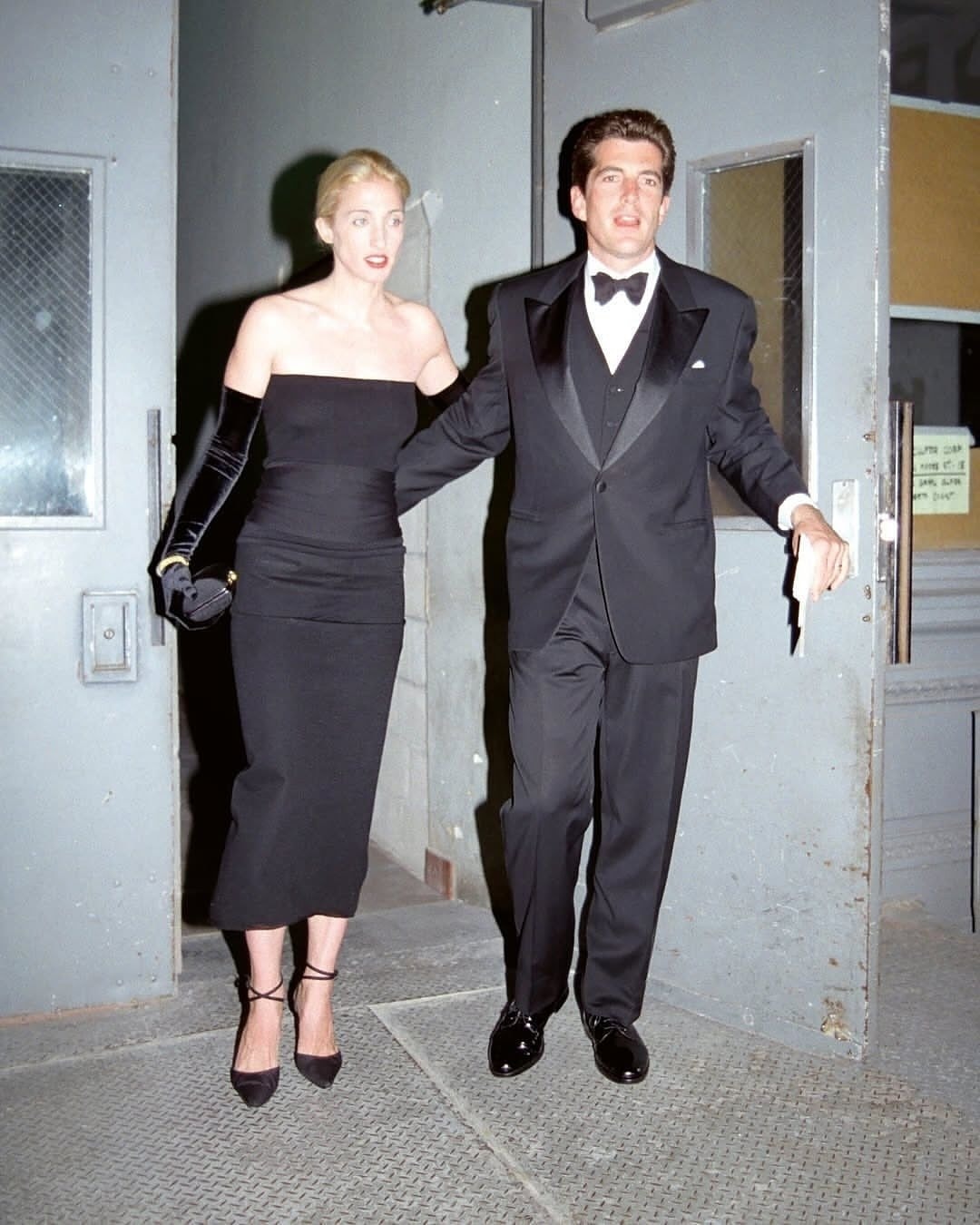 Một ví dụ về phong cách dự tiệc đẹp mắt của Bessette Kennedy là bộ đầm đen tối giản dáng quây ngực của Yohji Yamamoto. Bà phối cùng găng tay nhung và giày cao gót quai mảnh khi cùng chồng đến dự sự kiện của Hiệp hội Nghệ thuật Thành phố năm 1998. Theo Harper's Bazaar, bộ đầm trở thành một trong những bộ trang phục dạ hội được yêu thích nhất của bà. Để tạo thêm điểm nhấn, bà đeo bên ngoài găng tay một chiếc vòng vàng đính đá quý. Ảnh: Pinterest