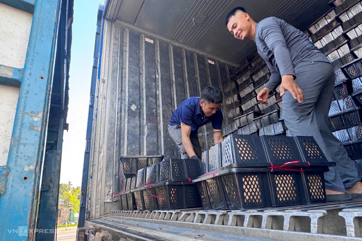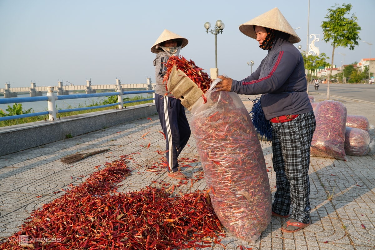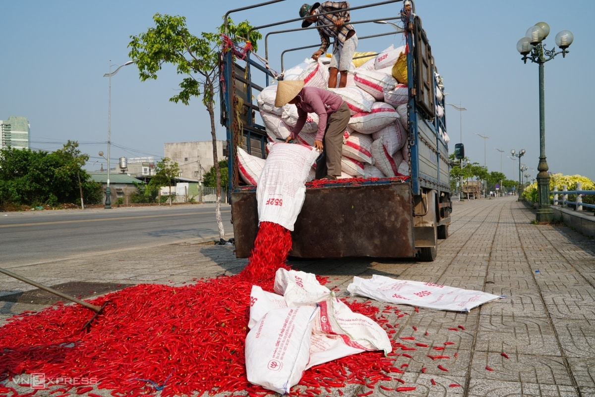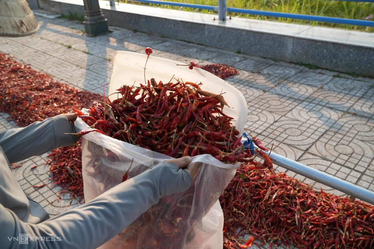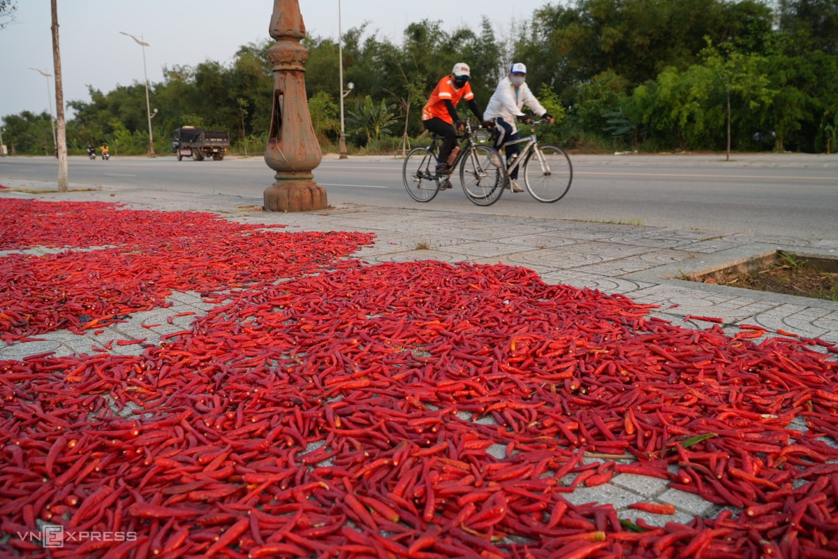 Buổi sáng, xe tải nhỏ chở ớt ra vỉa hè đường Trường Sa (bờ nam sông Trà Khúc), Quảng Ngãi để phơi. Ớt tươi chủ yếu xuất khẩu tiểu ngạch sang Trung Quốc, song năm nay nhu cầu giảm, chi phí vận tải tăng khiến giá chỉ còn 5.000-7.000 đồng mỗi kg, người dân vì thế phơi ớt nhiều hơn mọi năm.