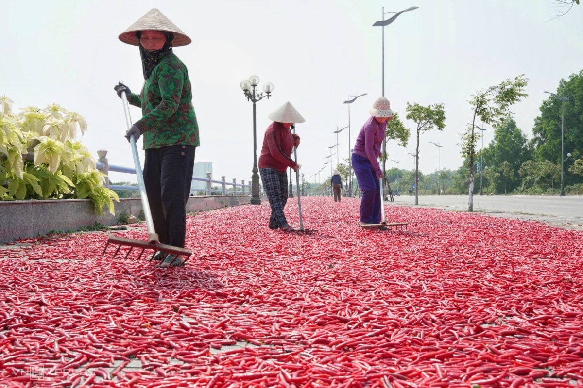 Hàng tấn ớt được người dân trải kín vỉa hè đường Trường Sa dài gần 9 km ven sông Trà Khúc, tạo nên "con đường đỏ" rực rỡ giữa mùa thu hoạch.
