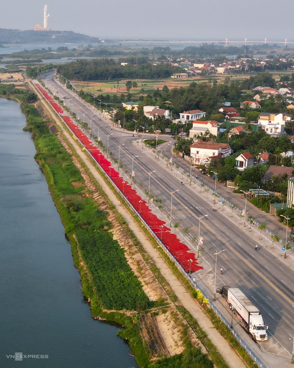 Người dân đạp xe tập thể dục qua "con đường ớt" trên tuyến Trường Sa ven sông Trà Khúc, Quảng Ngãi. "Đường màu đỏ đẹp nhưng là cái đẹp từ mồ hôi nước mắt của nông dân”, anh Hùng Anh nói.