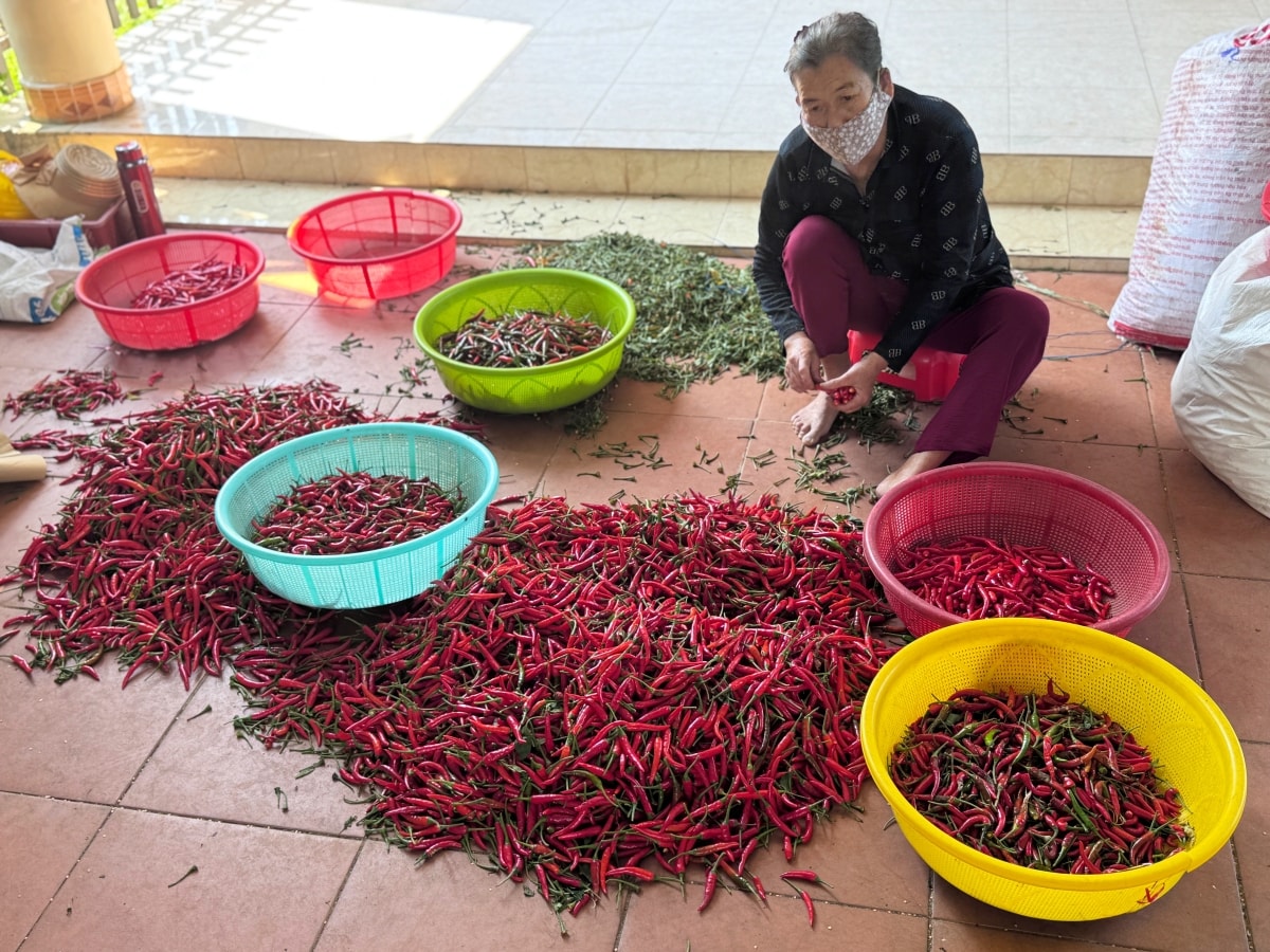 Sau khi thu hoạch, ớt được đưa về các vựa ở Quảng Ngãi để lặt cuống trước khi phơi. Toàn tỉnh có khoảng 1.000 ha ớt vụ Đông Xuân; trước đầu ra phụ thuộc thị trường Trung Quốc, Chi cục Trồng trọt và Bảo vệ thực vật đề xuất phát triển vùng sản xuất tập trung, tăng kết nối doanh nghiệp và xây dựng chuỗi liên kết nhằm giảm rủi ro giá cả.
