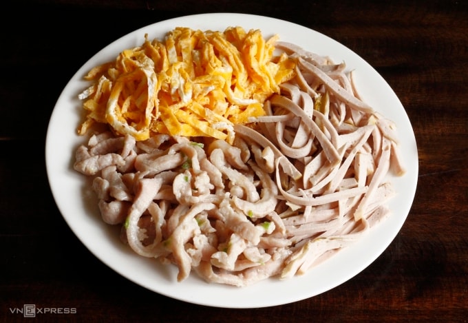 Chuẩn bị nhân xào cùng: Giò cắt sợi dài. Thịt nạc vai cắt hình que, ướp gia vị xào sơ. Trứng đánh tan với chút mắm, hạt nêm, hạt tiêu đem tráng mỏng, thái sợi.
