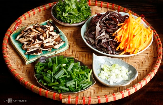 Chuẩn bị các nguyên liệu khác: Tùy chọn theo sở thích và theo mùa như: Cà rốt gọt vỏ, thái sợi. Nấm hương, mộc nhĩ ngâm nở rửa sạch, thái sợi. Hành, mùi rửa sạch cắt khúc. Đầu hành để riêng dùng phi thơm khi xào.