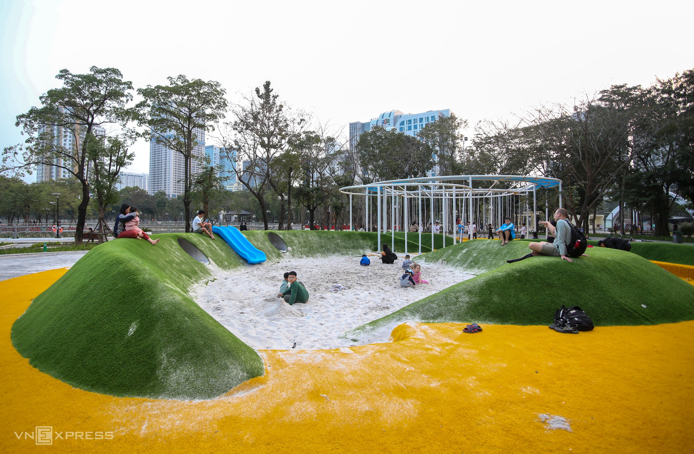 Phần quảng trường trong công viên được đổ bêtông, lát đá và phủ lớp sơn tăng cứng chống rêu mốc. Sau khi hoàn thành, khu vực này thu hút người trẻ đến vui chơi, tập luyện các môn thể thao mạo hiểm.