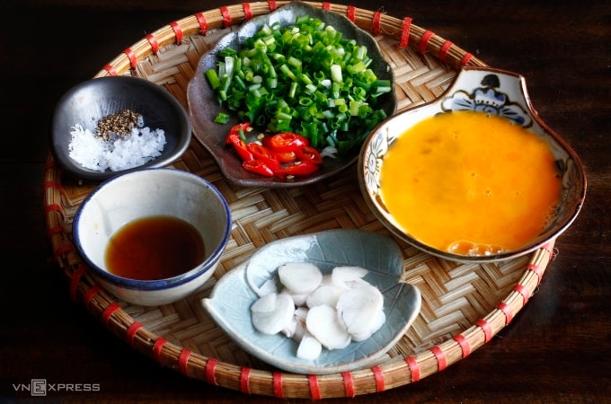 Chuẩn bị các nguyên liệu khác: Hành khô bóc vỏ, thái lát. Hành lá, rau mùi rửa sạch, cắt khúc. Các gia vị nêm nếm truyền thống như muối hạt, nước mắm truyền thống, hạt tiêu. Tùy khẩu vị có thể thêm ớt bỏ hạt, thái lát. Trứng gà đánh tan cùng chút gia vị cho đậm đà.