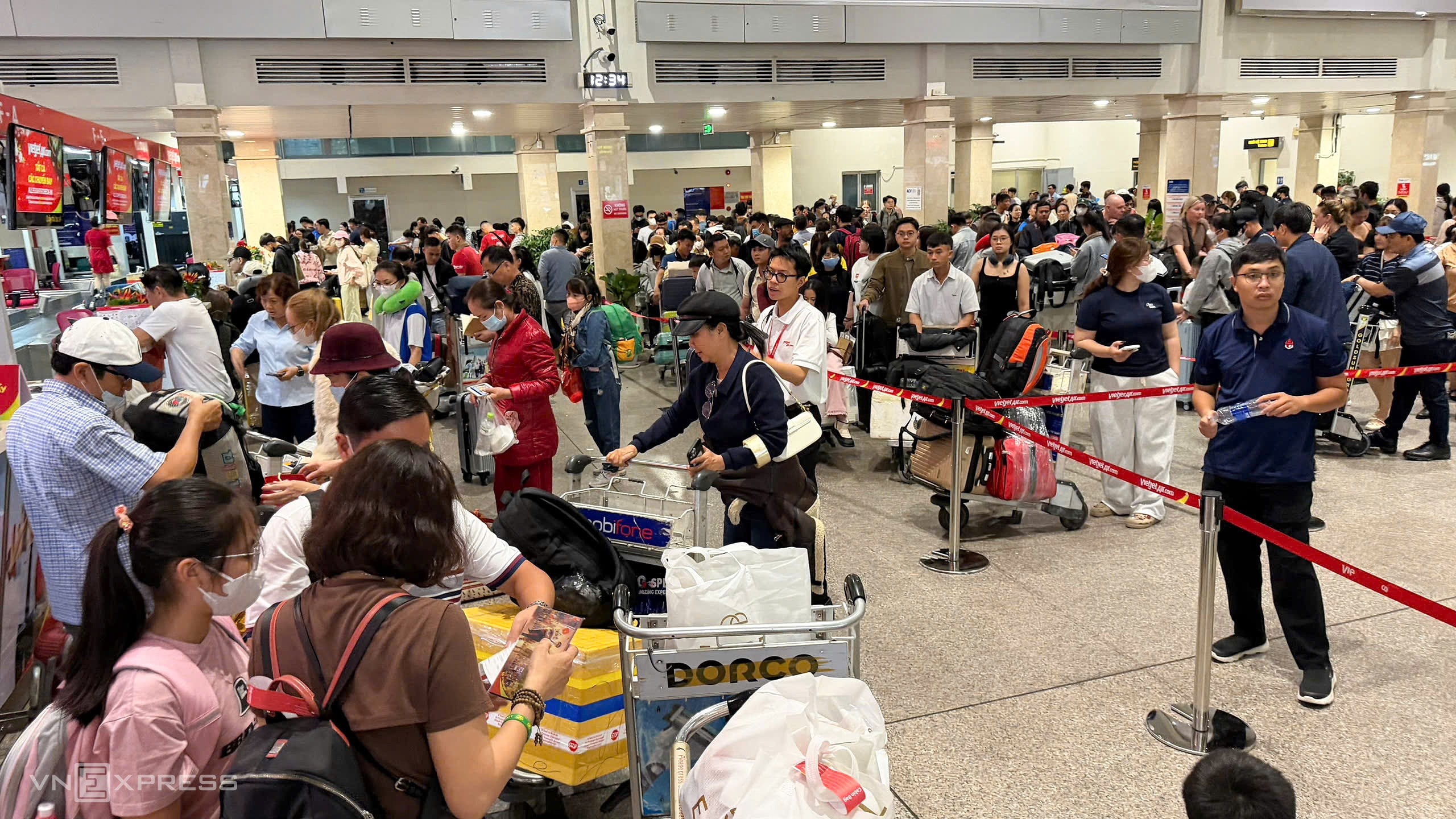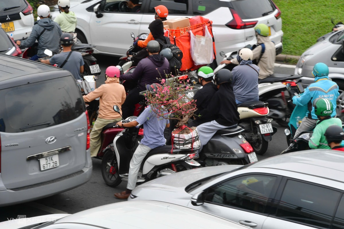 Hàng nghìn ôtô, xe máy chen nhau trên đường vào Tân Sơn Nhất, bên trong sân bay cũng đông nghịt người chờ làm thủ tục về quê dịp Tết, trưa 11/2 (24 tháng Chạp).