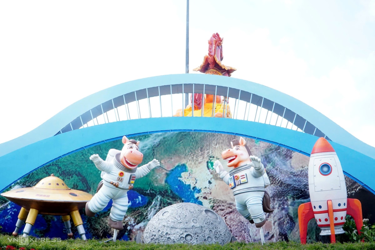 Không gian phía sau cụm linh vật chính như một backdrop có bố trí các hiệu ứng ánh sáng, hơi nước, bong bóng khói làm tăng phần lung linh cho hình tượng phi thuyền, ngựa phi hành gia bay vào vũ trụ... thể hiện khát vọng chinh phục đỉnh cao khoa học, kỹ thuật của thế hệ trẻ Gia Lai hôm nay.
