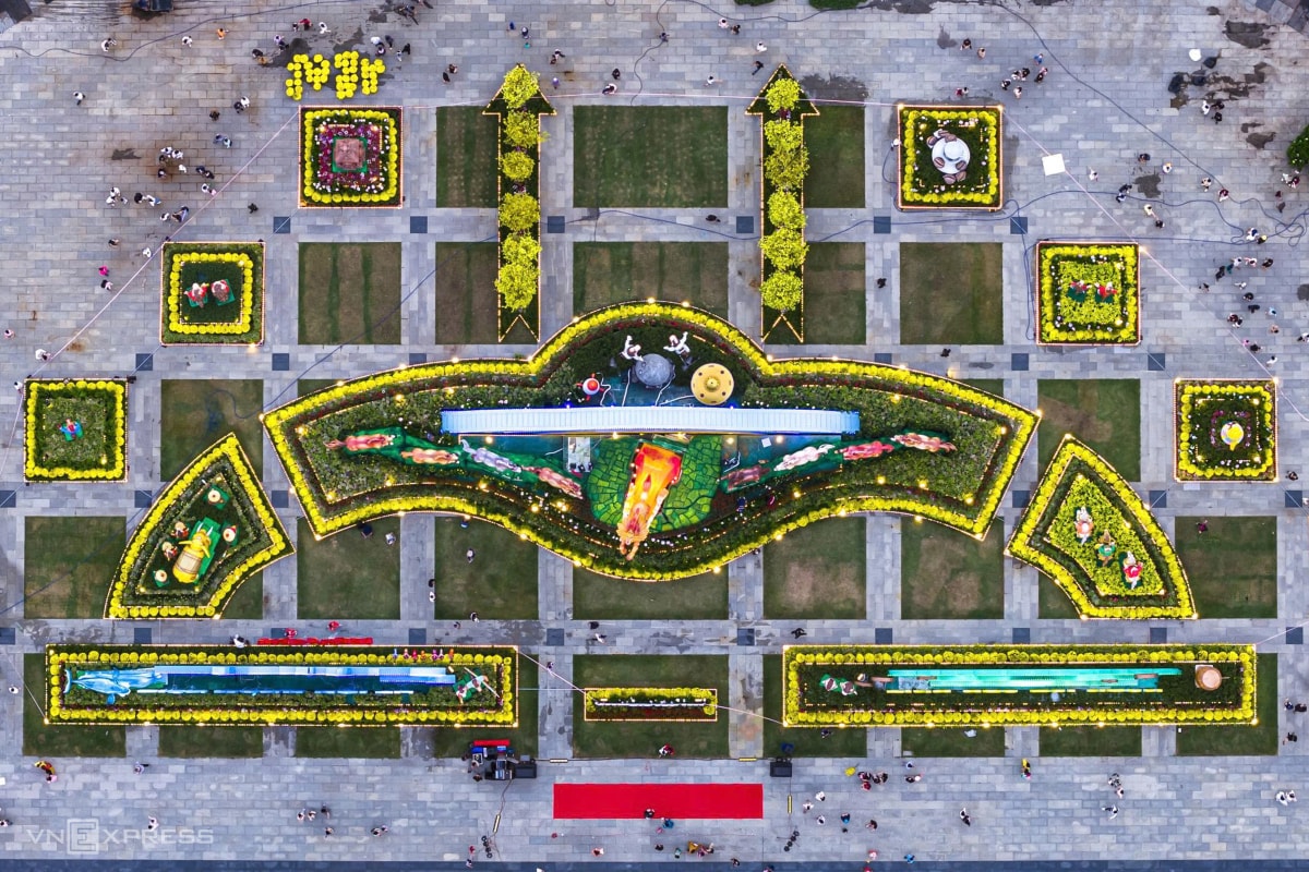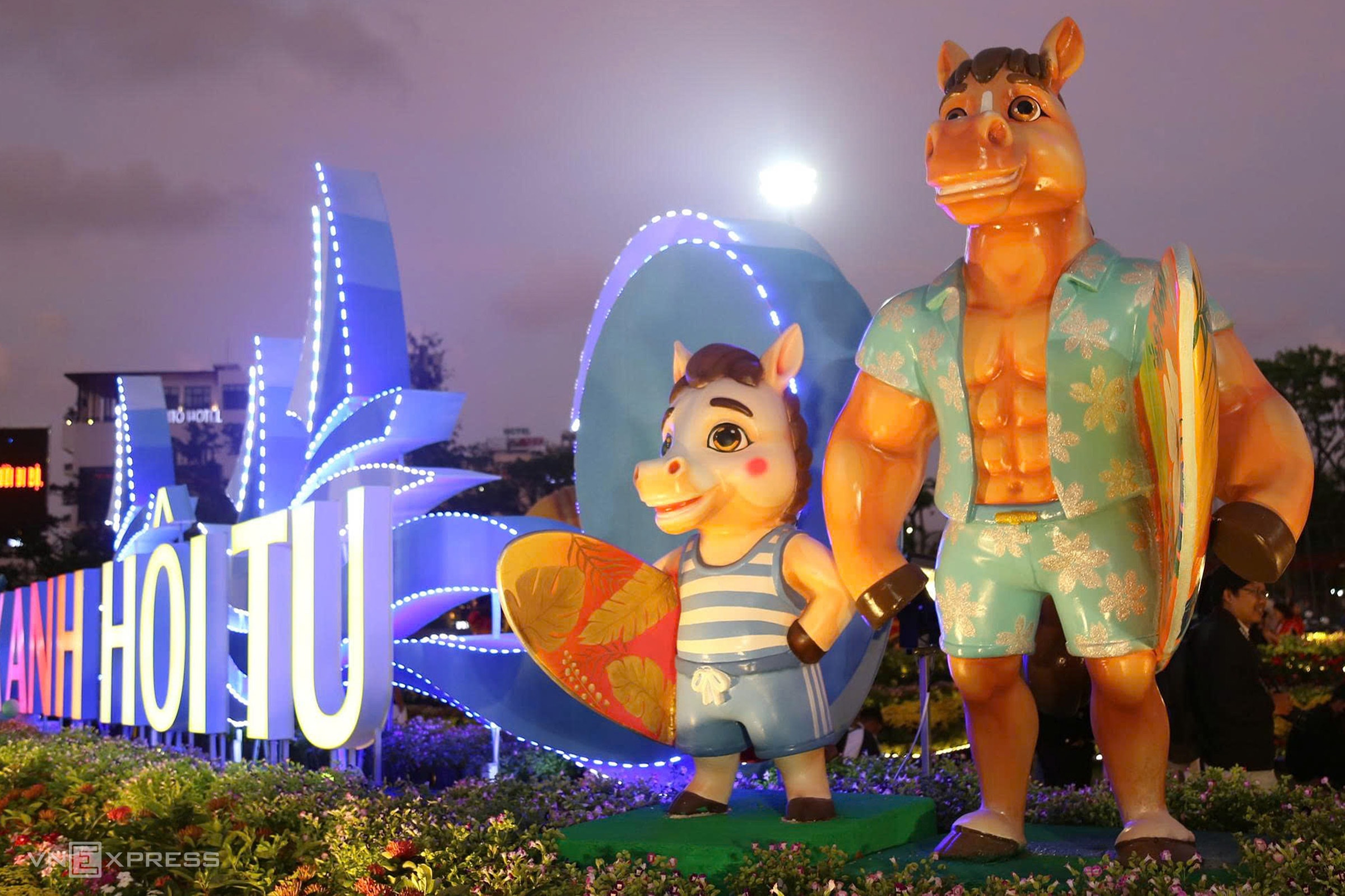 Đông đảo người dân, du khách tham quan cụm linh vật Xuân Bính Ngọ tại quảng trường Nguyễn Tất Thành. Ảnh: Dũng Nhân