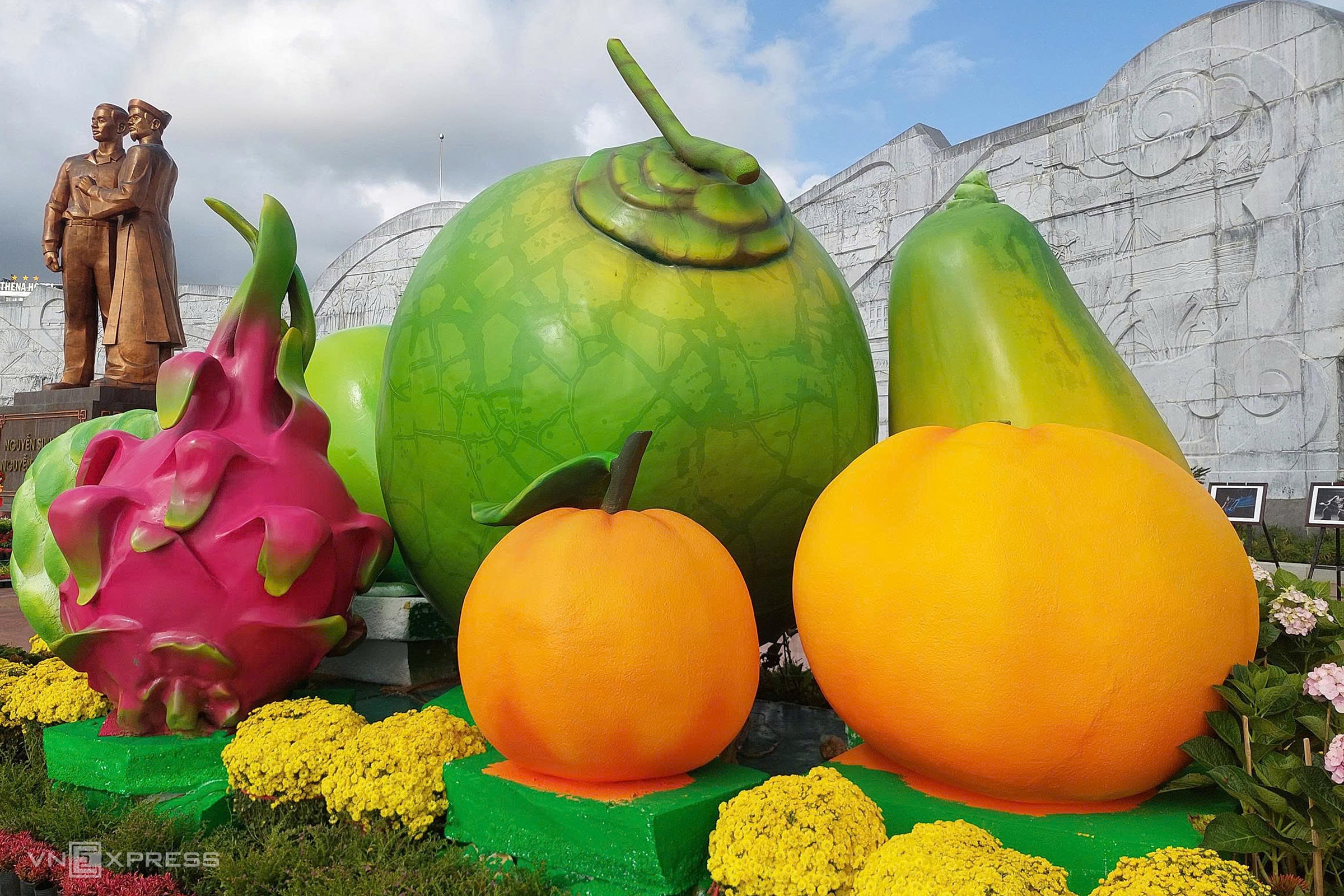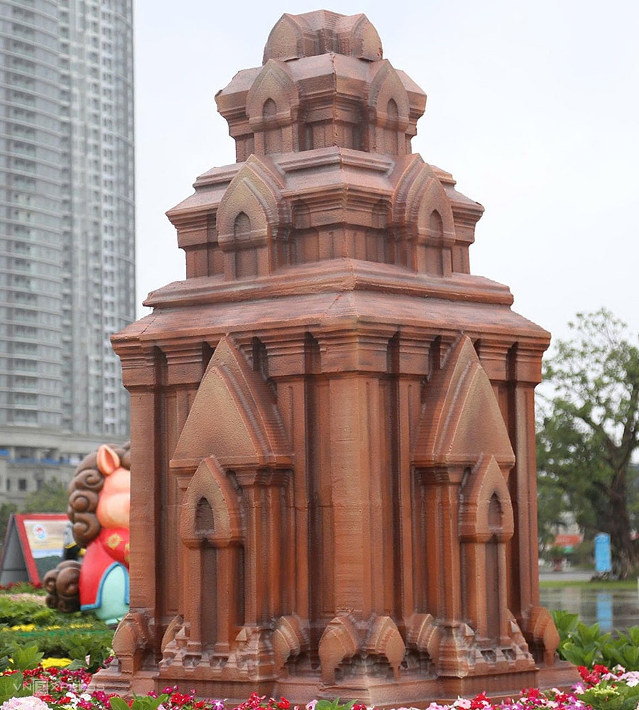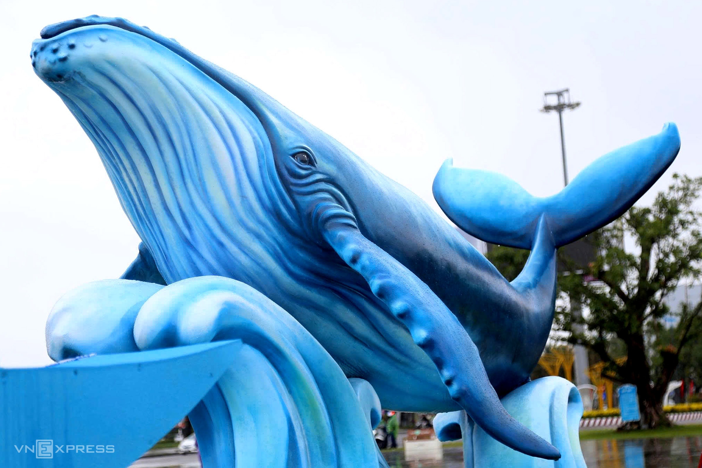 Cá voi, tháp Chăm và những sản vật đặc trưng của tỉnh Bình Định cũ như dừa, thanh long... được tái hiện tại cụm linh vật.