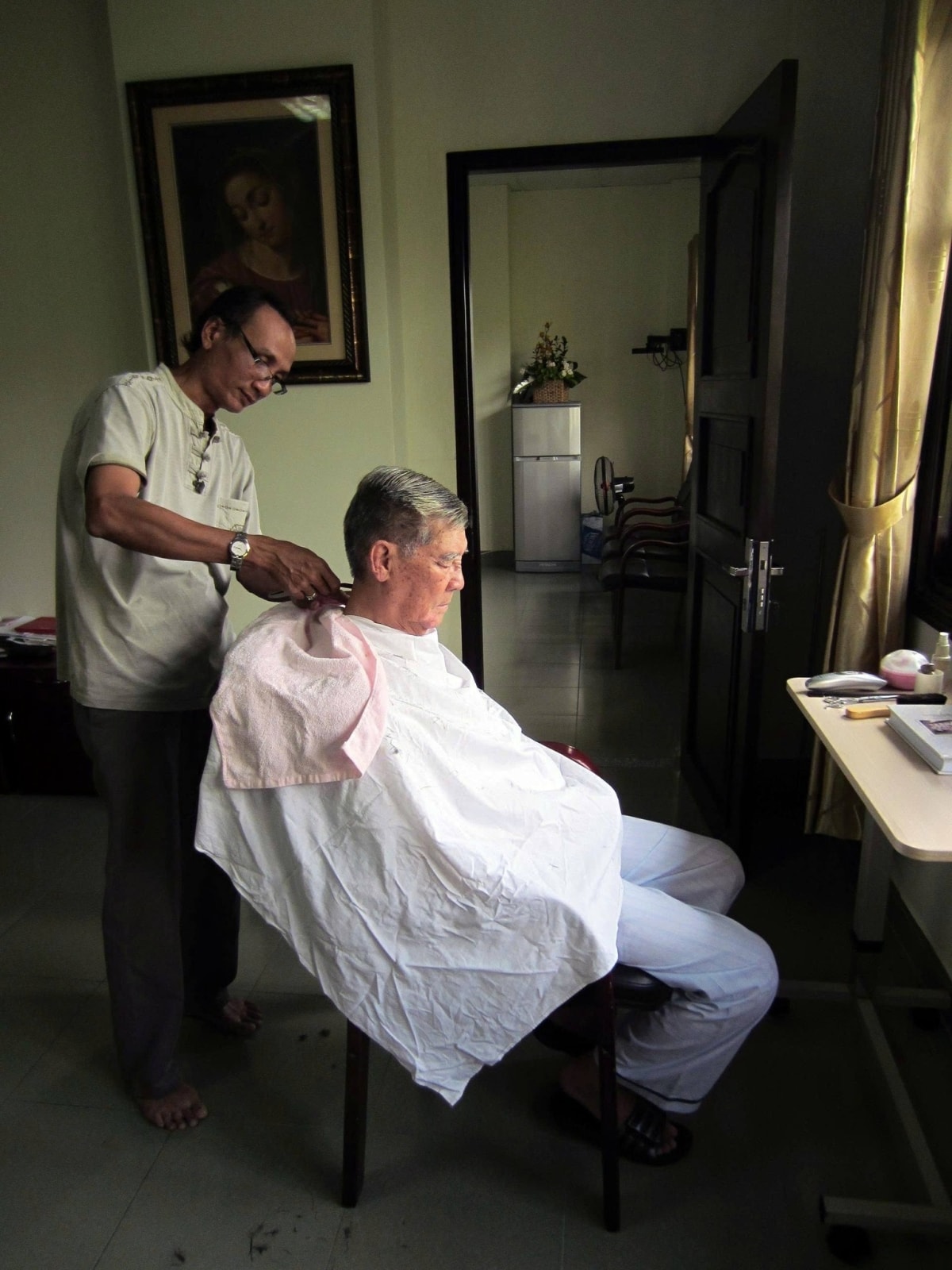 Ông Phúc kể, thời gian đầu khi cha về làm Tổng giám mục thường đi cắt tóc ở tiệm vỉa hè gần Nhà thờ Đức Bà. Sau này được người quen giới thiệu, ông Phúc có cơ duyên phục vụ. Theo ông Phúc, khi cắt tóc Đức Hồng y không yêu cầu gì, chỉ cần gọn gàng và giữ một kiểu suốt 24 năm. "Mỗi lúc cắt tóc, cha ngồi sẵn ở ngoài sân, chỉ cần dùng tông đơ và kéo", ông nói. Ảnh: Bùi Hồng Sơn