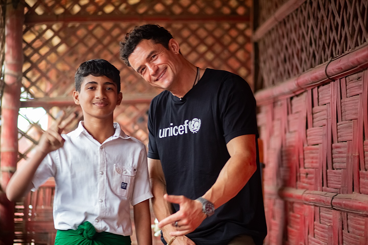 Ngoài diễn xuất, anh tham gia các dự án xã hội. Orlando Bloom đang là đại sứ thiện chí của UNICEF (Quỹ Nhi đồng Liên Hiệp Quốc). Tháng 11/2025, anh đến thăm Cox's Bazar - trại tị nạn lớn nhất thế giới ở Bangladesh, trò chuyện với trẻ em và các thanh thiếu niên ở đây. Ảnh: UNICEF