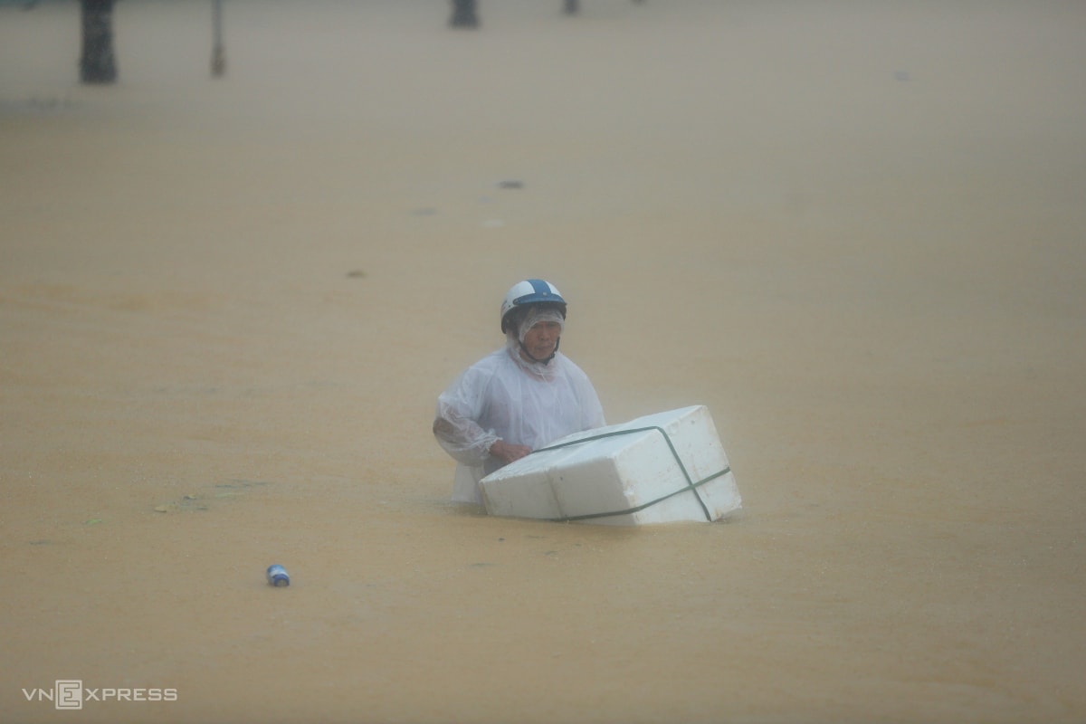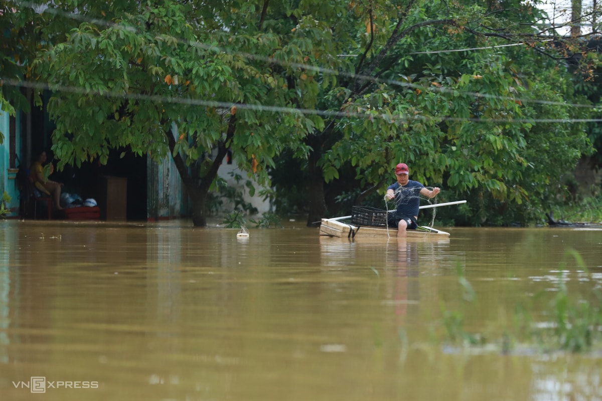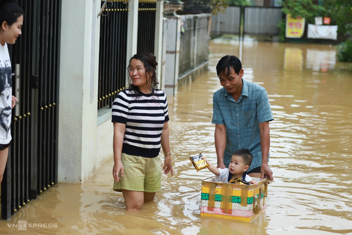 Người dân phường An Cựu kéo thùng xốp đi chợ, chở trẻ nhỏ, vừa làm phao cứu sinh trong những ngày lũ cao 2 m, giao thông tê liệt.