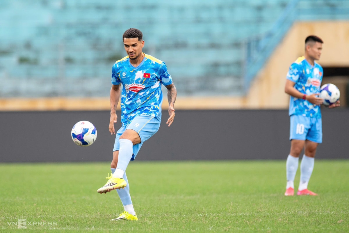 Tiền vệ nhập tịch gốc Brazil Đỗ Hoàng Hên của Hà Nội FC thoải mái tập luyện, chờ cơ hội ra mắt đội tuyển Việt Nam vào ngày mai.