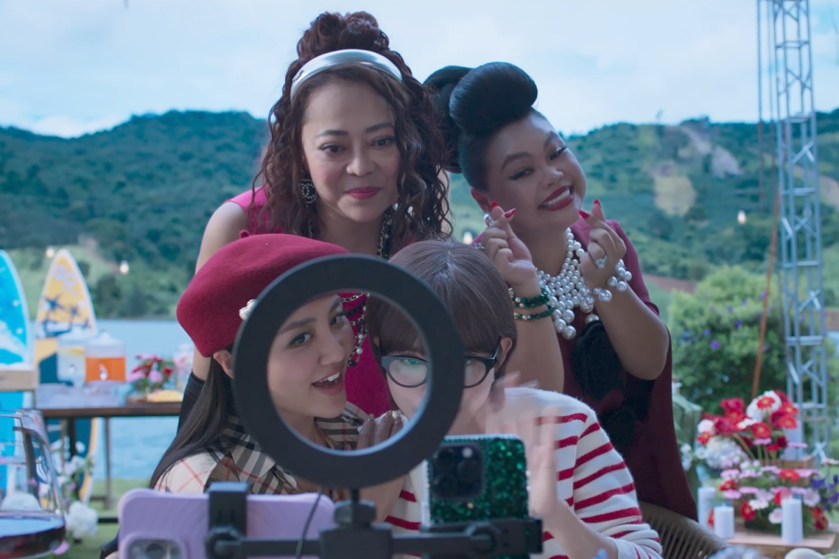 TikToker Ngọc Nguyễn (hàng sau, trái) - 40 tuổi - đóng vai thành viên hội chị em thân thiết của Hải Linh, Hải Lan. Năm 2024, cô gây ấn tượng với vai người hàng xóm thẳng thắn, tốt tính trong Mai - phim từng đoạt kỷ lục doanh thu 520 tỷ đồng của Trấn Thành. Năm 2025, cô tiếp tục đóng Bộ tứ báo thủ nhưng bị đạo diễn cắt hết phân đoạn để đảm bảo thời lượng.