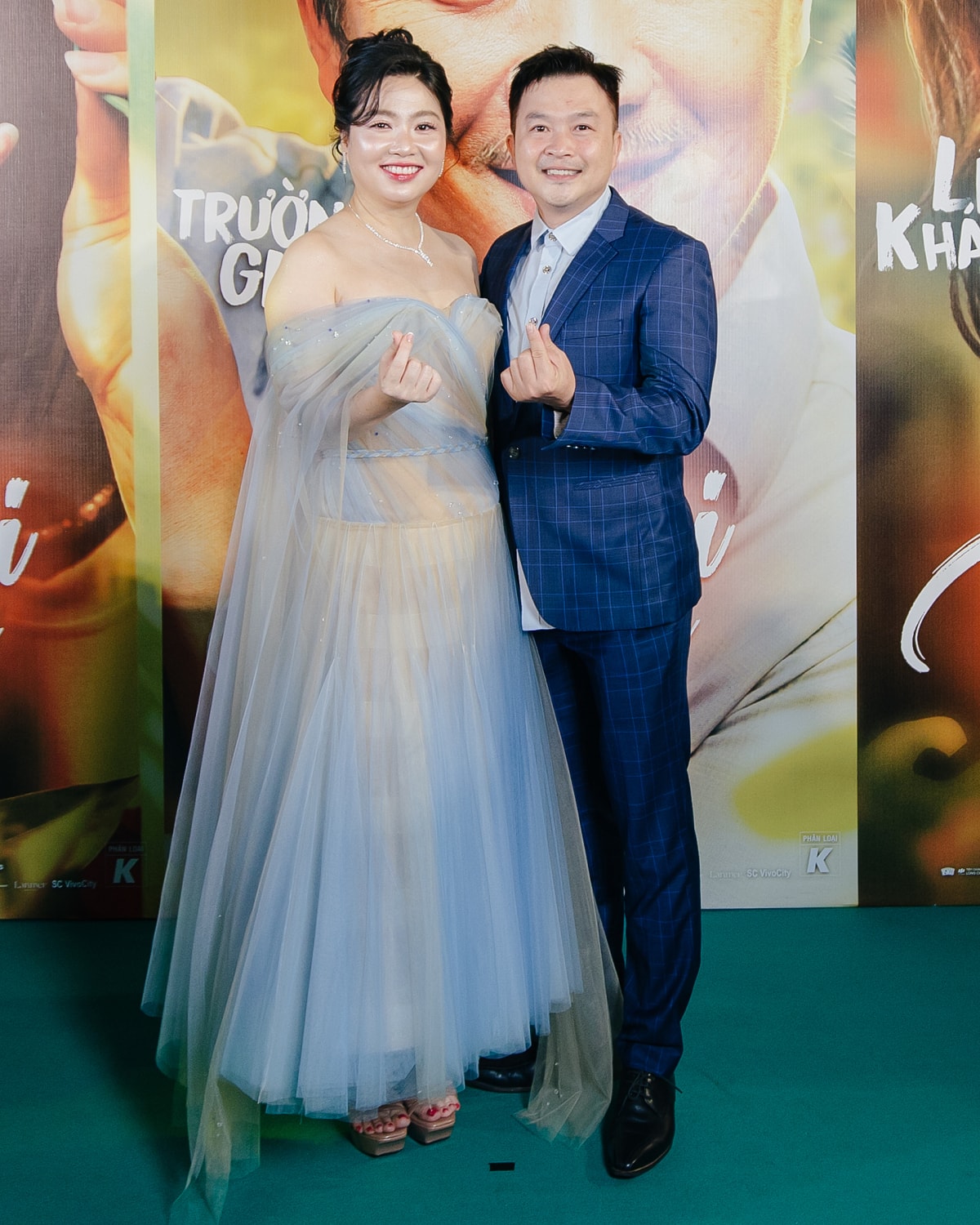 Nghệ sĩ chọn đầm dạ hội trễ vai với lớp voan xuyên thấu. Tuấn Khải - chồng Lê Khánh - phối suit xanh navy kẻ ô cùng sơ mi sáng màu.