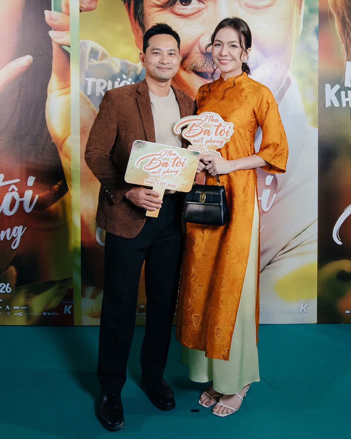 Diễn viên Huỳnh Đông phối blazer nâu và áo thun. Vợ anh - Ái Châu, Á hậu Phụ nữ Việt Nam 2005 - nổi bật trong tà áo dài gấm sắc cam. Cả hai kết hôn và sinh con trai năm 2015, có tên thân mật là Happy.