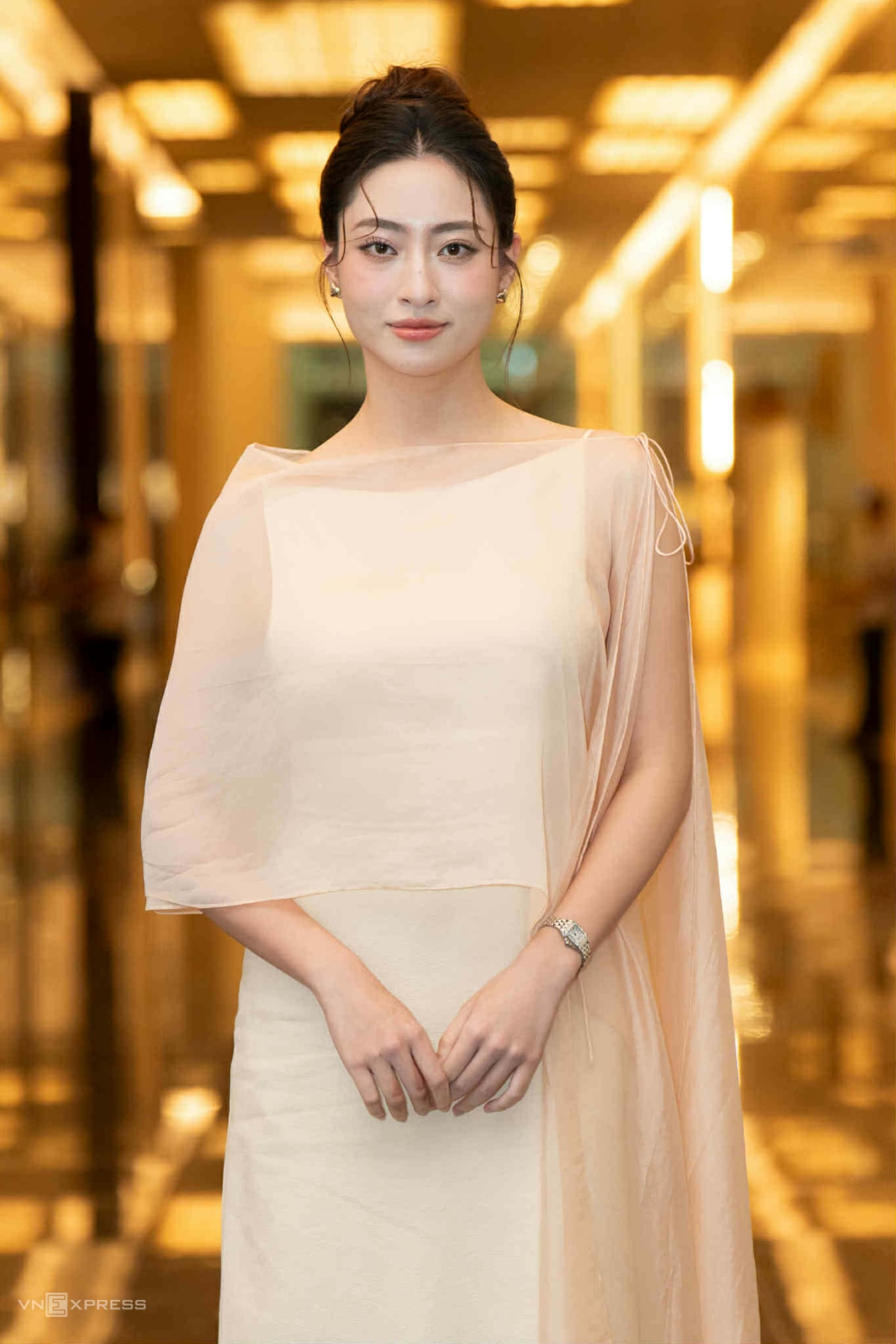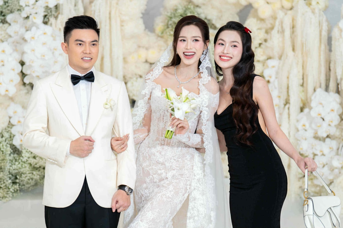 Hoa hậu Lương Thùy Linh, Á hậu Hoàng Thùy đến chúc mừng Hoa hậu Đỗ Thị Hà và ông xã Viết Vương, tại tiệc cưới, chiều 9/11.
