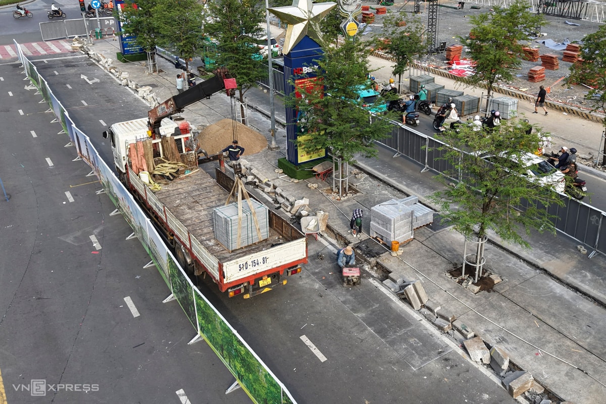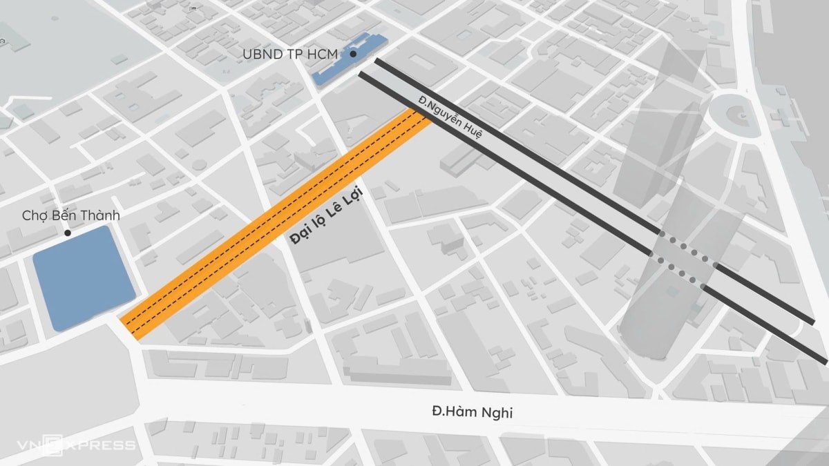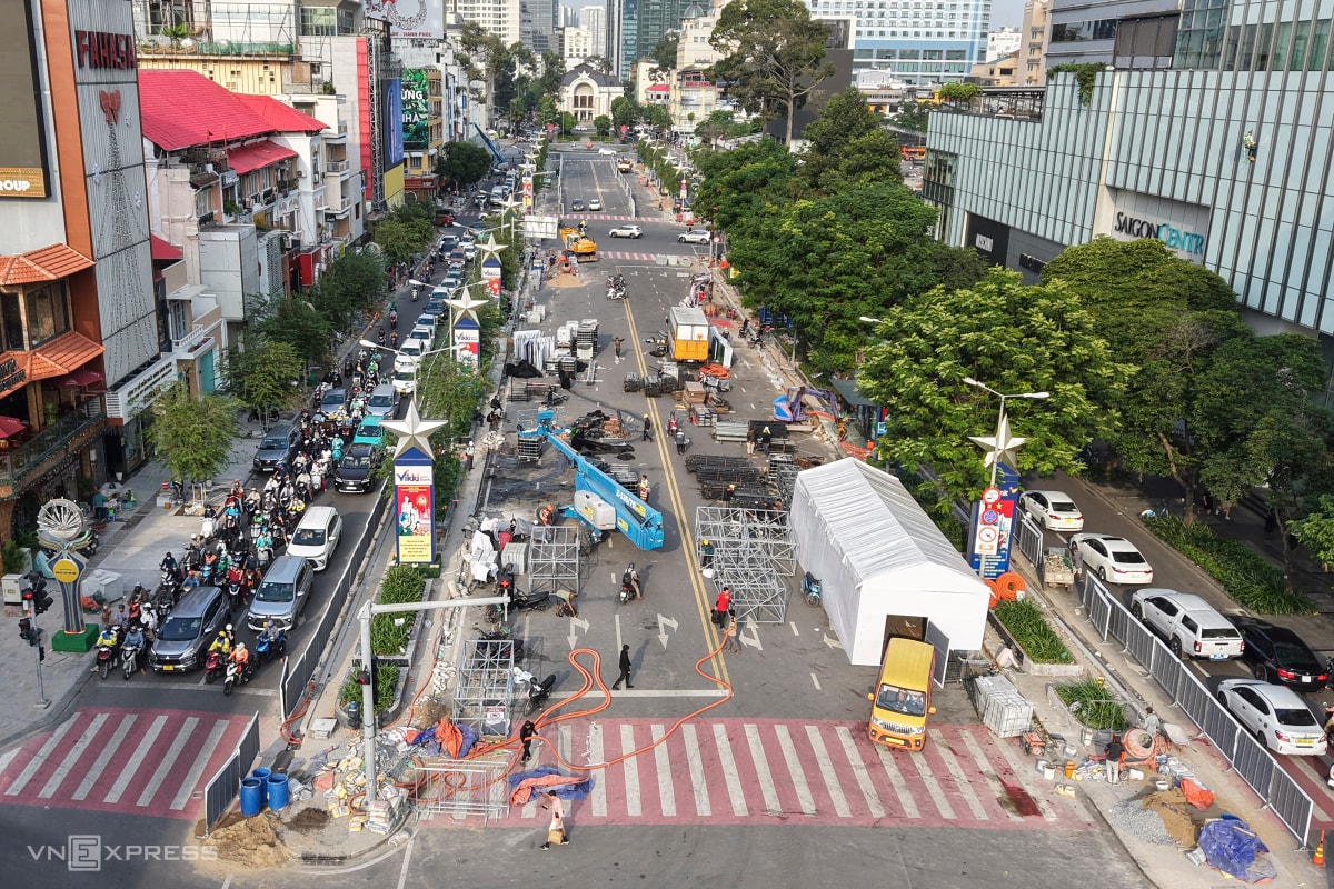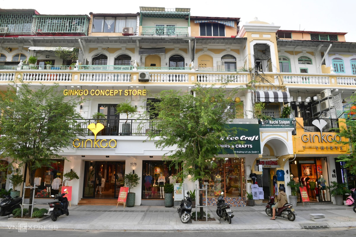 Những ngôi nhà xây từ thời Pháp trên đại lộ Lê Lợi, gần chợ Bến Thành, được sơn sửa mặt tiền với tông màu đồng nhất, vỉa hè lát đá granite tạo điểm nhấn đón năm mới.